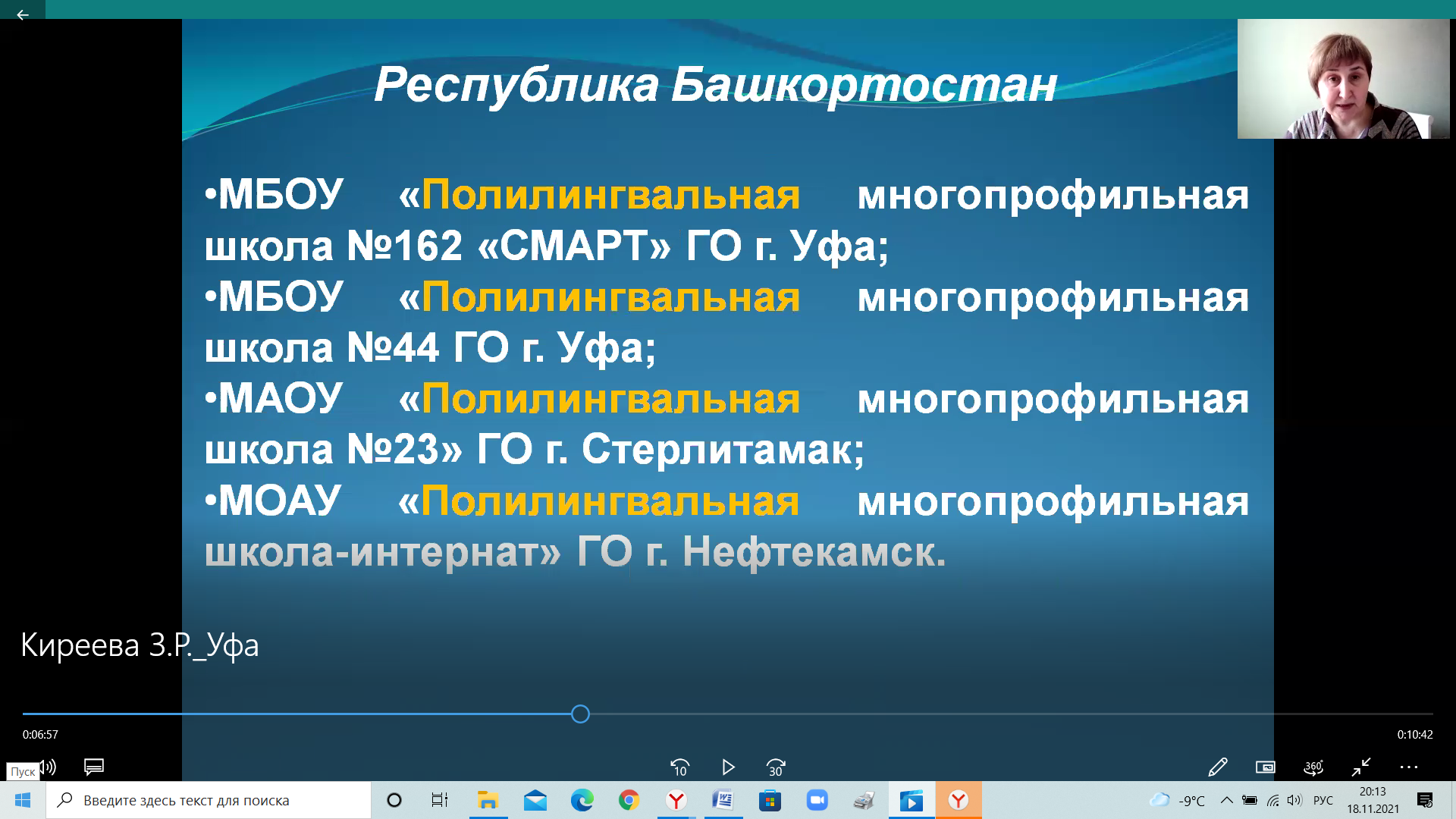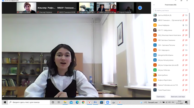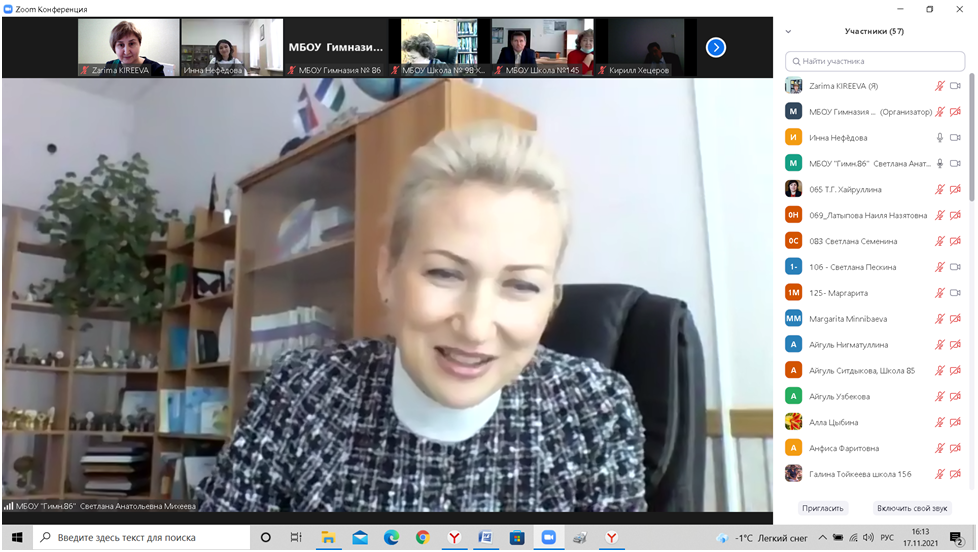 17 ноября 2021 г. на платформе ZOOM состоялся семинар «Воспитание личности школьника в условиях полилингвальной школы» в рамках районного «Фестиваля педагогических идей» для руководителей, заместителей руководителей по учебно-воспитательной работе, учителей родных и иностранных языков средних общеобразовательных организаций Орджоникидзевского района. По приглашению Управления по гуманитарным вопросам и образованию Администрации Орджоникидзевского района ГО г.Уфы в работе семинара приняла участие доцент кафедры методики преподавания иностранных языков и второго иностранного языка З.Р.Киреева, которая ознакомила коллег с основными полилингвальными моделями поликультурного образования, реализуемыми в регионах Российской Федерации. Вопросы полилингвального образования актуальны для нашей республики. Учитывая актуальность данной проблемы и в соответствии с государственным заданием в области науки Министерства просвещения Российской Федерации с 2021 г. коллектив исследователей БГПУ им. М. Акмуллы работает над научно-исследовательским проектом «Сравнительный анализ практик внедрения полилингвальной модели поликультурного образования в РФ (на примере республик Башкортостан, Кабардино-Балкарской Республики, Республики Саха (Якутия), Республики Северная Осетия-Алания, Республики Татарстан, Чеченской Республики, Чувашской Республики). Доцент Киреева З.Р., которая в составе рабочей группы приняла участие в пилотажном исследовании, подробно остановилась на концептуальных положениях полилингвального образования, а также на вопросах научно-методического сопровождения образовательного процесса и организации внеурочной деятельности в полилингвальных школах. В работе семинара приняла участие заведующий методическим отделом МБОУ ДО «НИМЦ» Е.И.Трусова. Об особенностях реализации образовательных и воспитательной программ в условиях полилингвальной среды рассказали директор гимназии №86 г.Уфы С.А.Михеева,заместители директора данной гимназии И.В.Нефёдова, Т.Н.Алина и учителя иностранных языков.