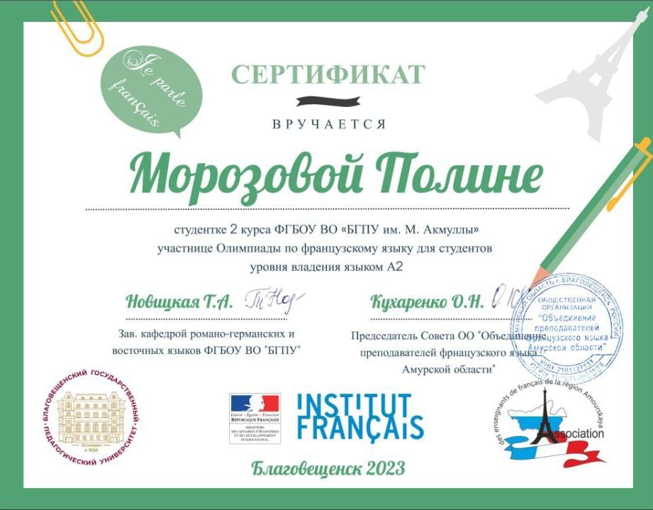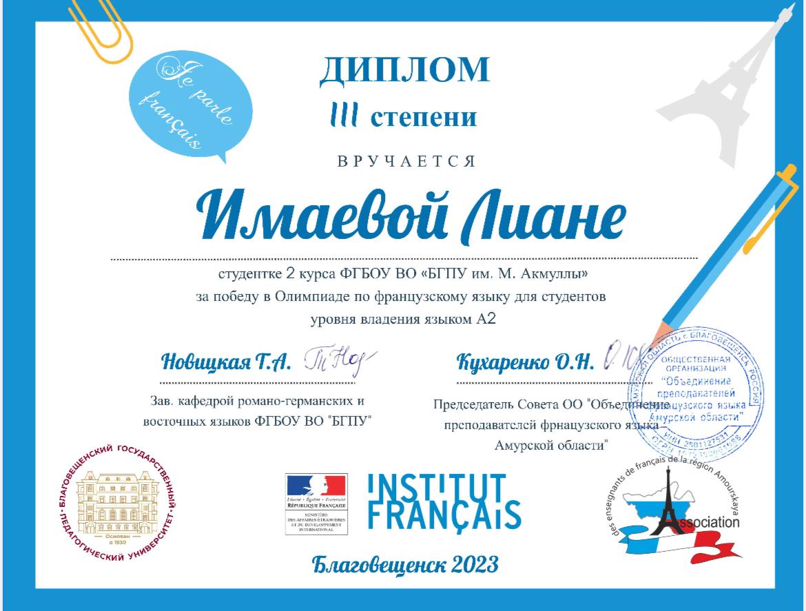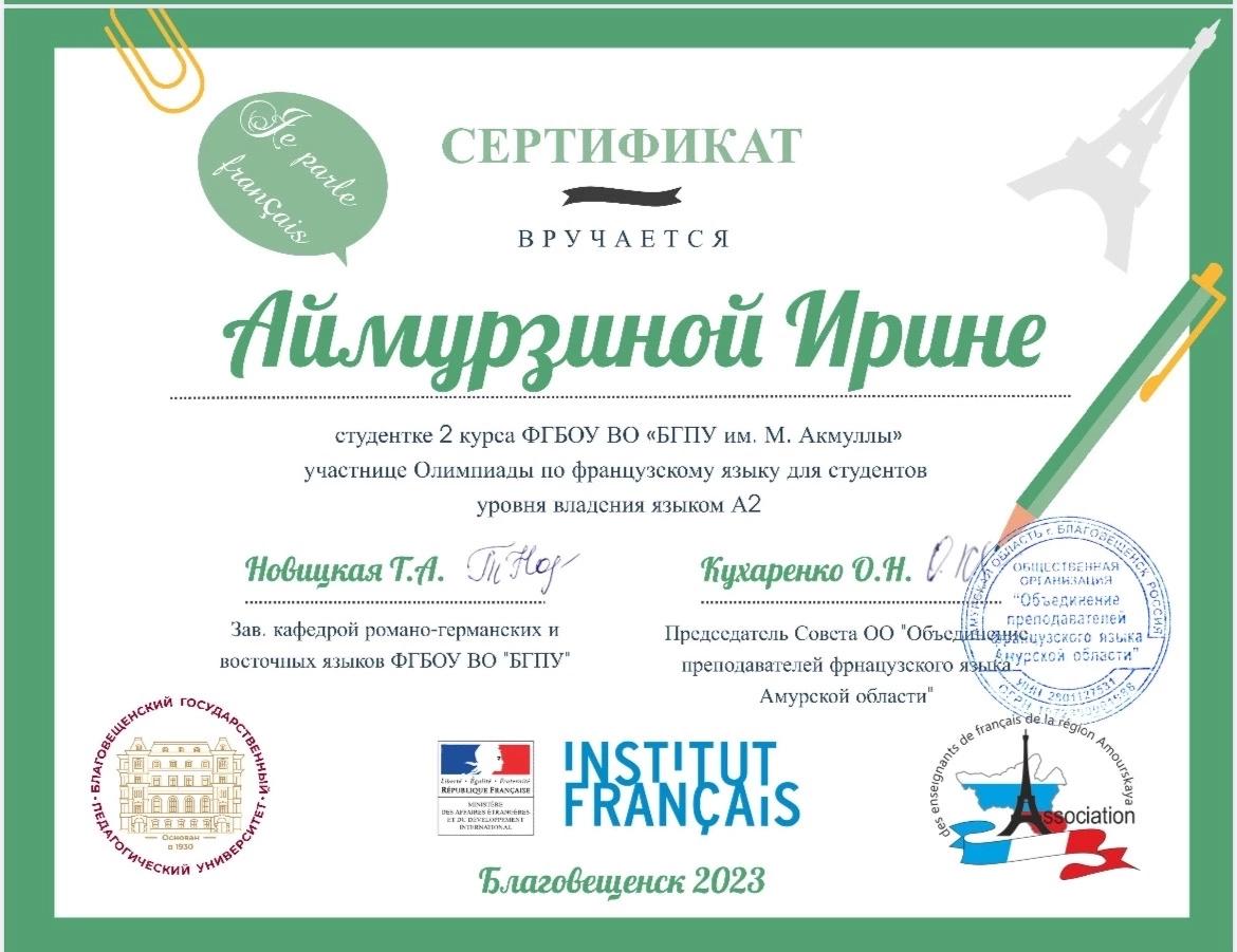 С 29 мая по 6 июня 2023 г. проходила Олимпиада по французскому языку среди студентов российских вузов, изучающих язык Мольера и Превера на уровне А2 по общеевропейской шкале. Организатором мероприятия выступила