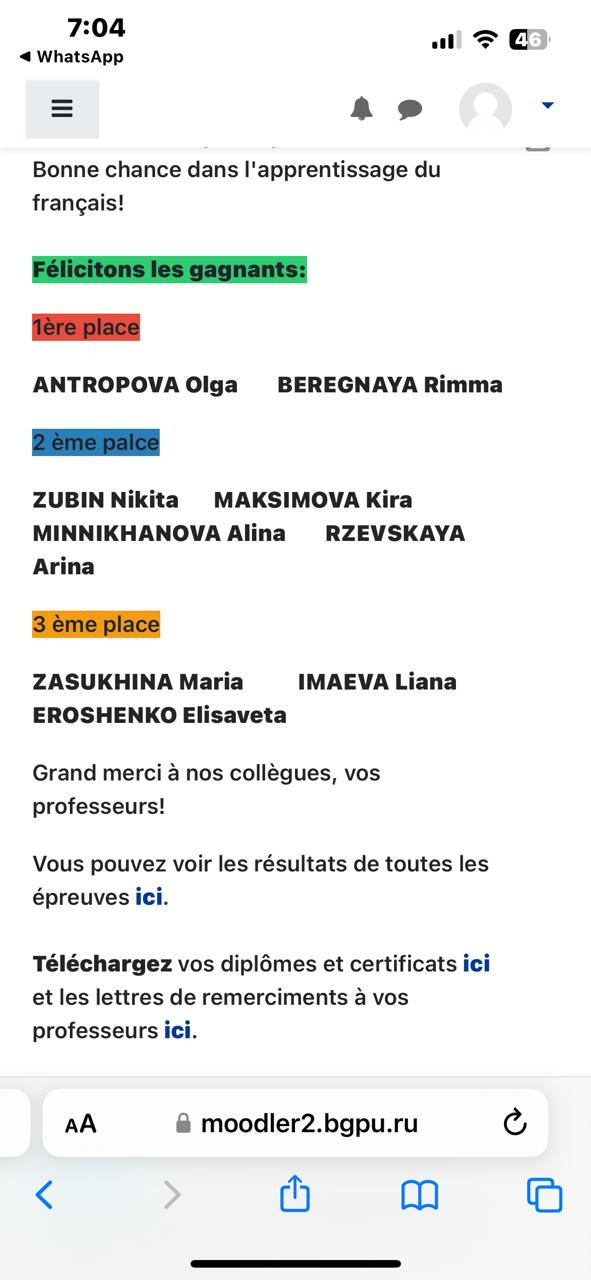 Студенты ИФОМК заняли 2 и 3 места в Олимпиаде по французскому языку