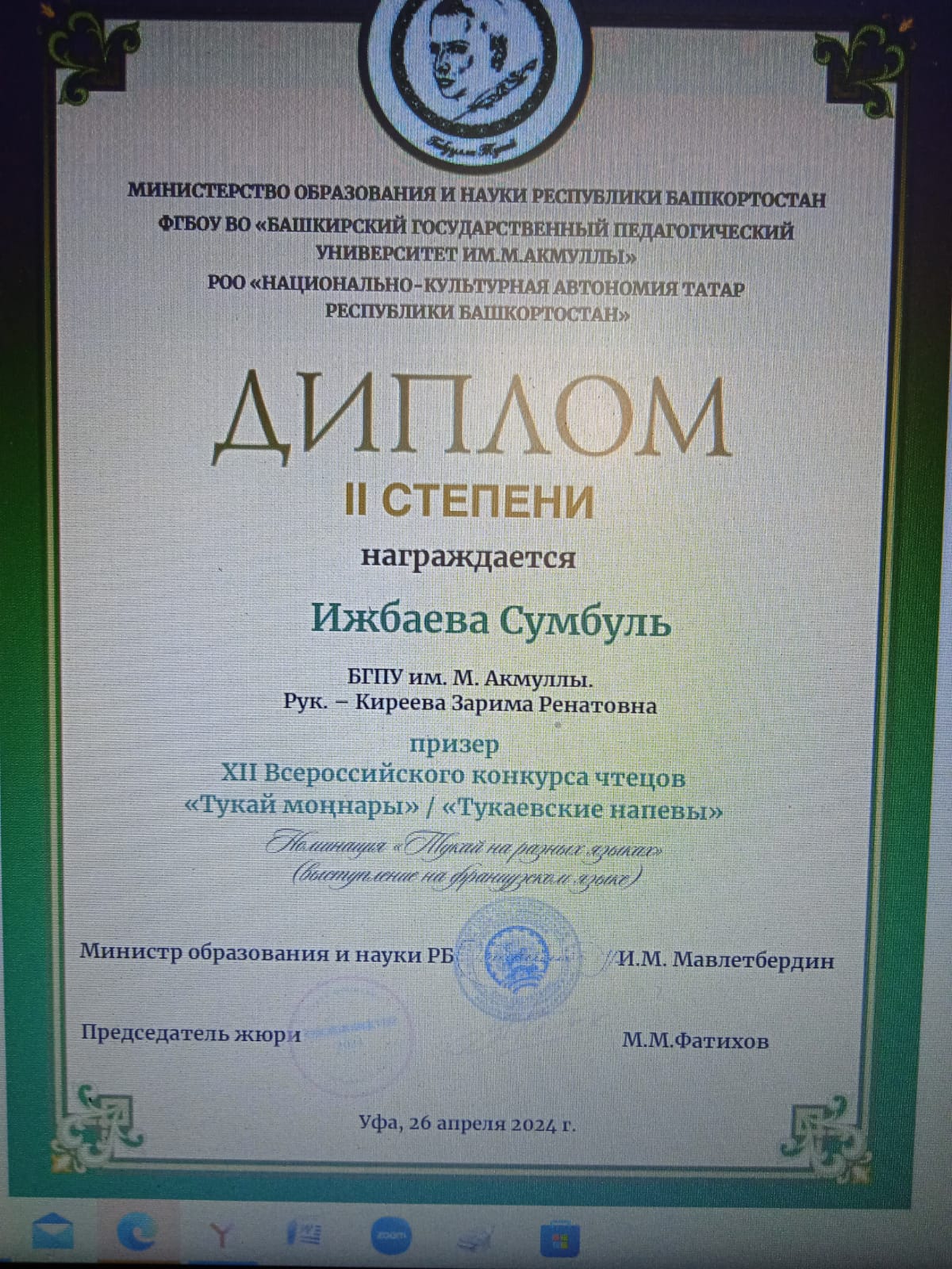 Поздравляем студентку группы ЛИНПП-22-22 Ижбаеву Сумбуль, занявшую 2 место в XII Всероссийском конкурсе чтецов «Тукай моңнары» («Тукаевские напевы»).