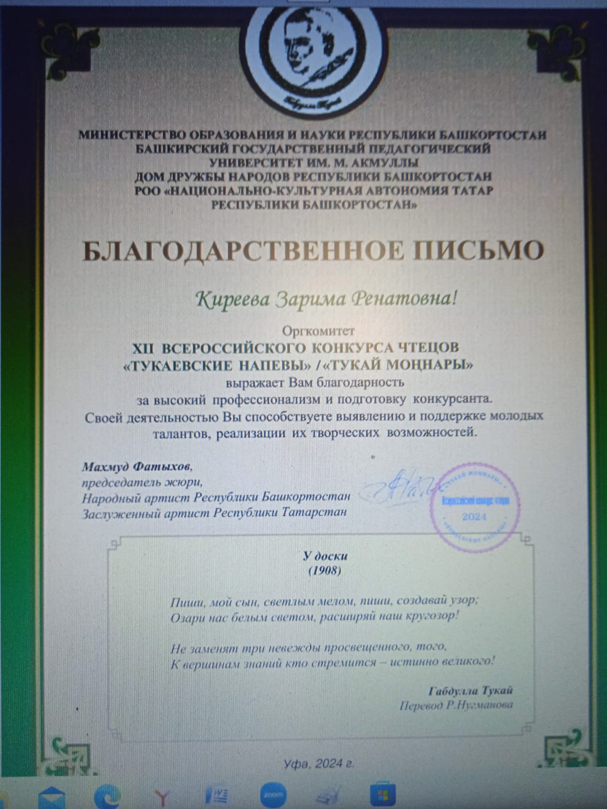 Наша конкурсантка достойно представила ИФОМК, исполнив стихотворение «Ребенку» Габдуллы Тукая на французском языке, и заняла 2 место в номинации «Тукай на разных языках».