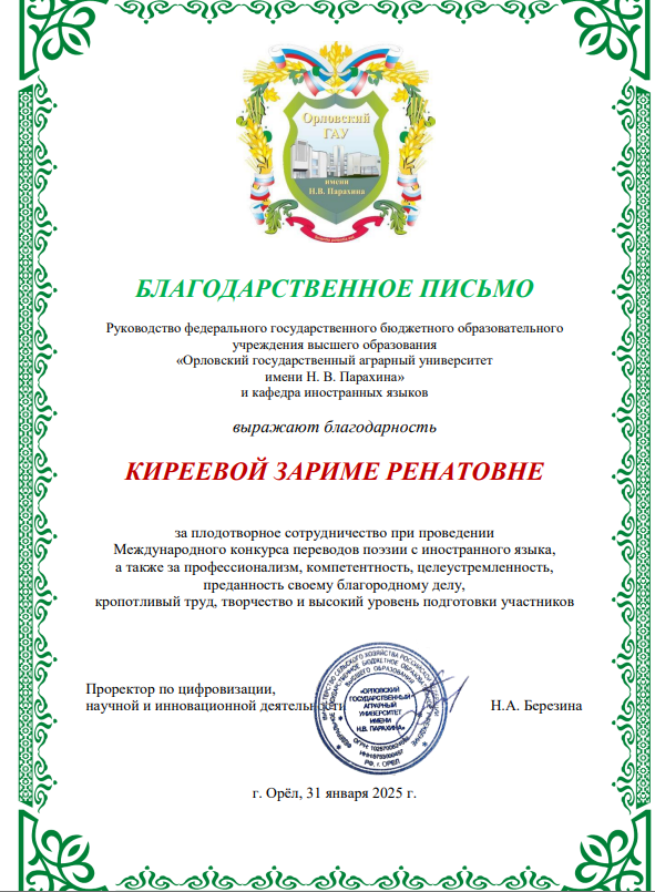 Руководство ФГБОУ ВО «Орловский государственный университет им. Н.В.Парахина» и кафедра иностранных языков выражают также благодарность наставнику Линары – доценту Киреевой З.Р. – за плодотворное сотрудничество при проведении Международного конкурса переводов поэзии с иностранного языка, а также за профессионализм, компетентность, целеустремленность, преданность своему благородному делу, кропотливый труд, творчество и высокий уровень подготовки участников.