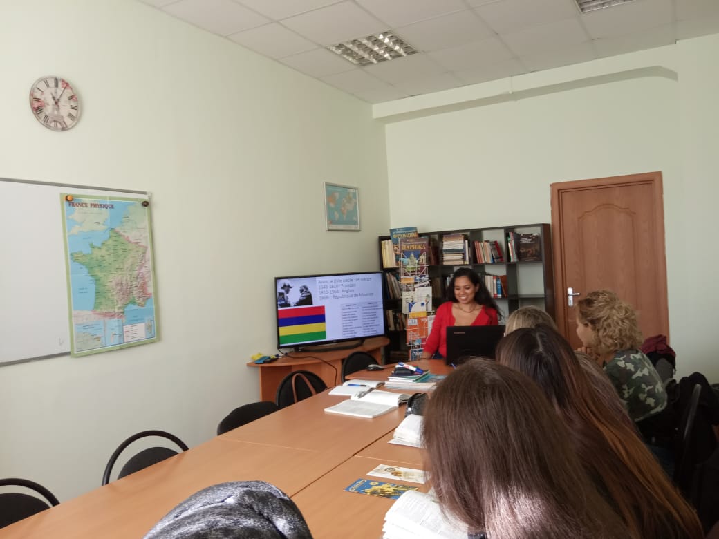 11 сентября 2019 г во Франкофонном ресурсном центре доцент З.Р.Киреева и волонтер Альянса Франсез-Уфа Селина Ришон провели занятия со студентами 2 и 4 курсов направления «Лингвистика», изучающими язык Мольера в качестве второго иностранного. Студентам 4 курса Селина рассказала о своей родине — Маврикии, — о её истории и географии, достопримечательностях и языковом многообразии. Большой интерес у студентов вызвали вопросы о системе образования в этой далекой стране, о направлениях туризма и видах транспорта. Селина, выпускница двух парижских университетов, представила систему образования Маврикия и Франции в сопоставительном плане, ответила на все интересующие студентов вопросы. Будущие переводчики, в свою очередь, ответили на вопросы гостьи о российской системе образования. Следует отметить, что студенты 4 курса владеют французским языком в достаточной степени для того, чтобы общаться с носителем языка без переводчика.