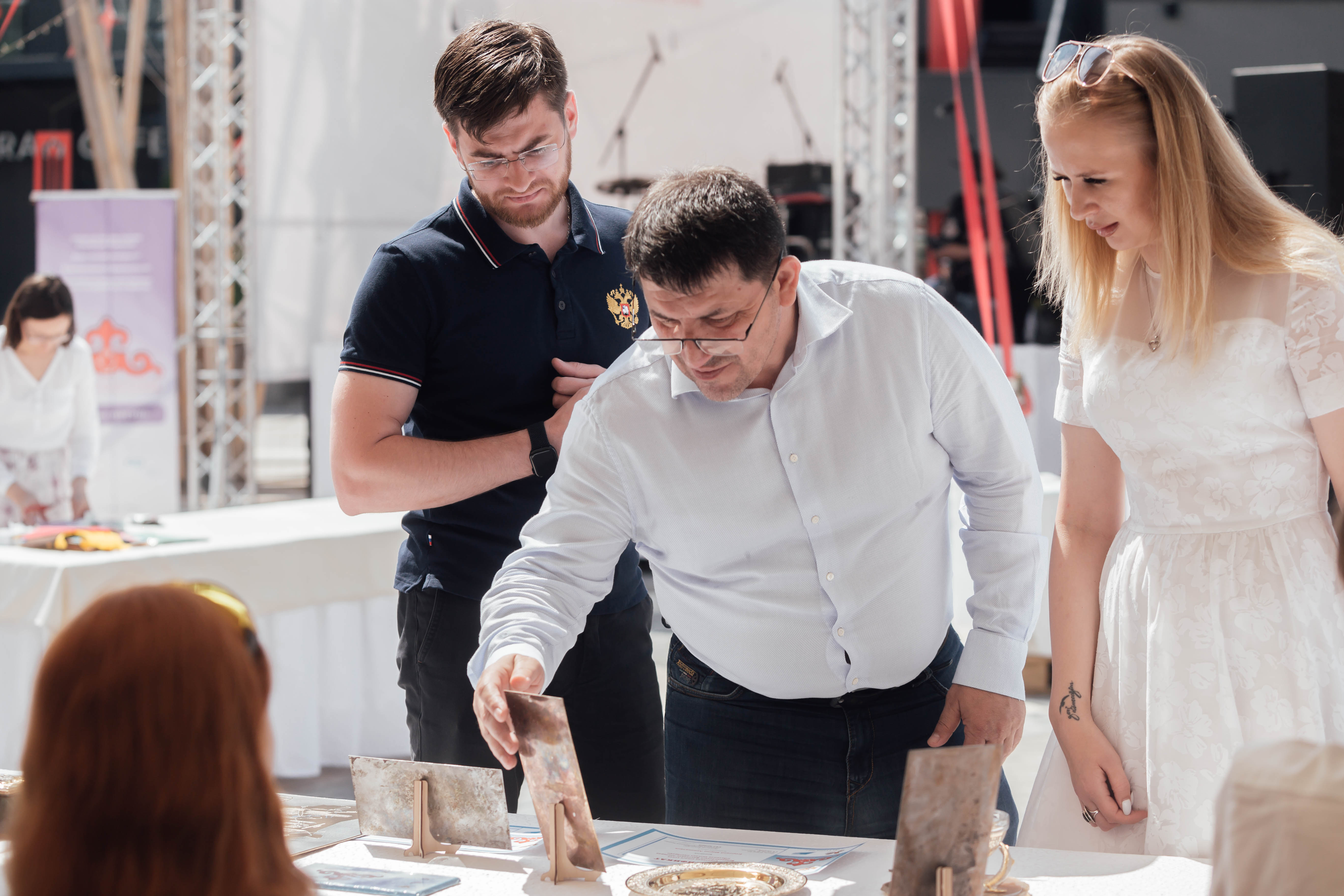 В выставочных шатрах расположились мастера росписи по ткани, стеклу, дереву и металлу, вышивке, плетению кружев и из бисера, ручному ткачеству и валянию из шерсти, керамике, резьбе по дереву, работе с камнем и металлом, пчеловодству.