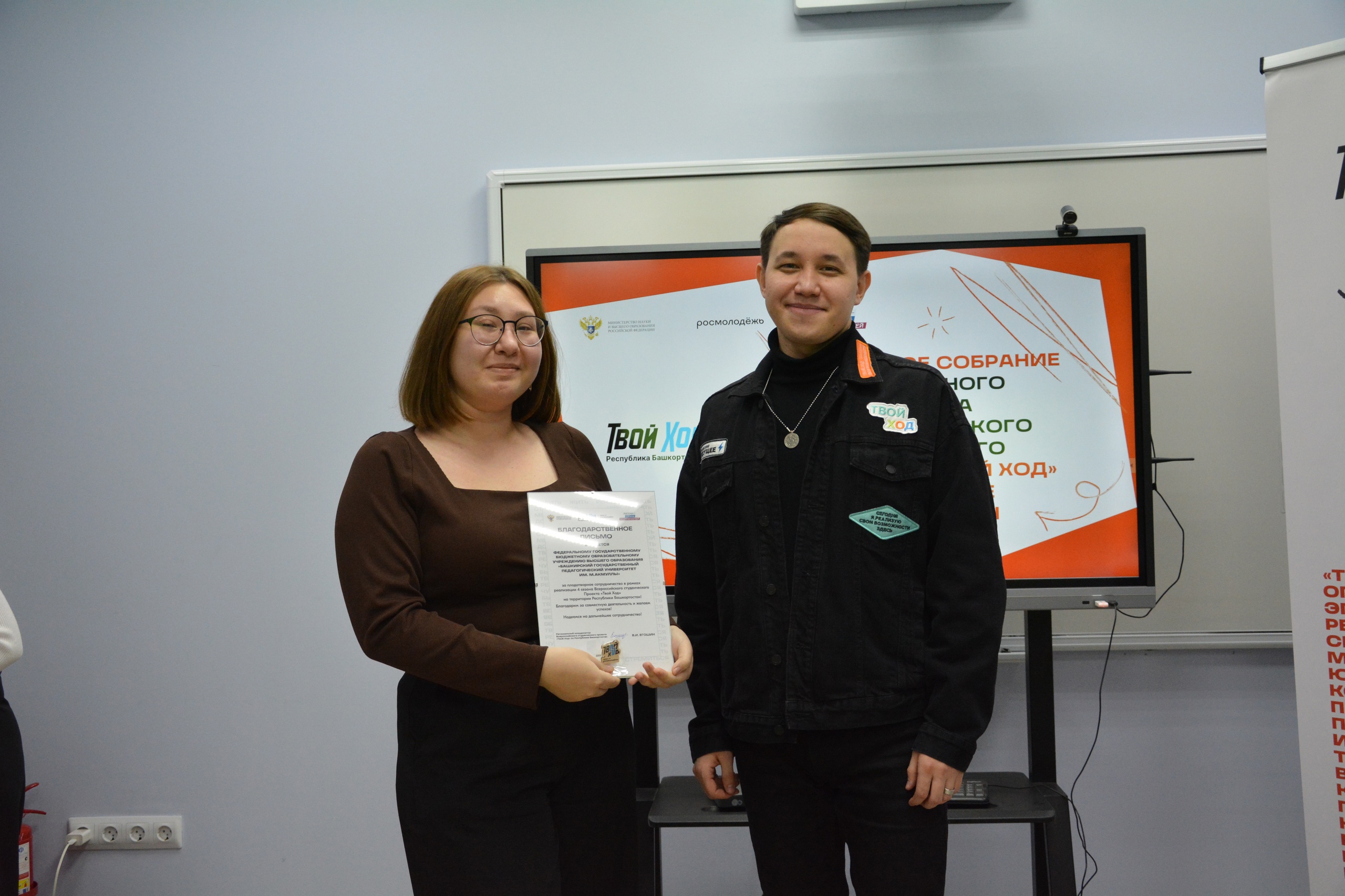 По окончанию собрания представителям Акмуллинского университета  было вручено благодарственное письмо за плодотворное сотрудничество в рамках реализации 4 сезона Всероссийского студенческого проекта «Твой ход». Это подчеркивает важную роль университета как надежного партнера проекта и активного участника развития студенческих инициатив.