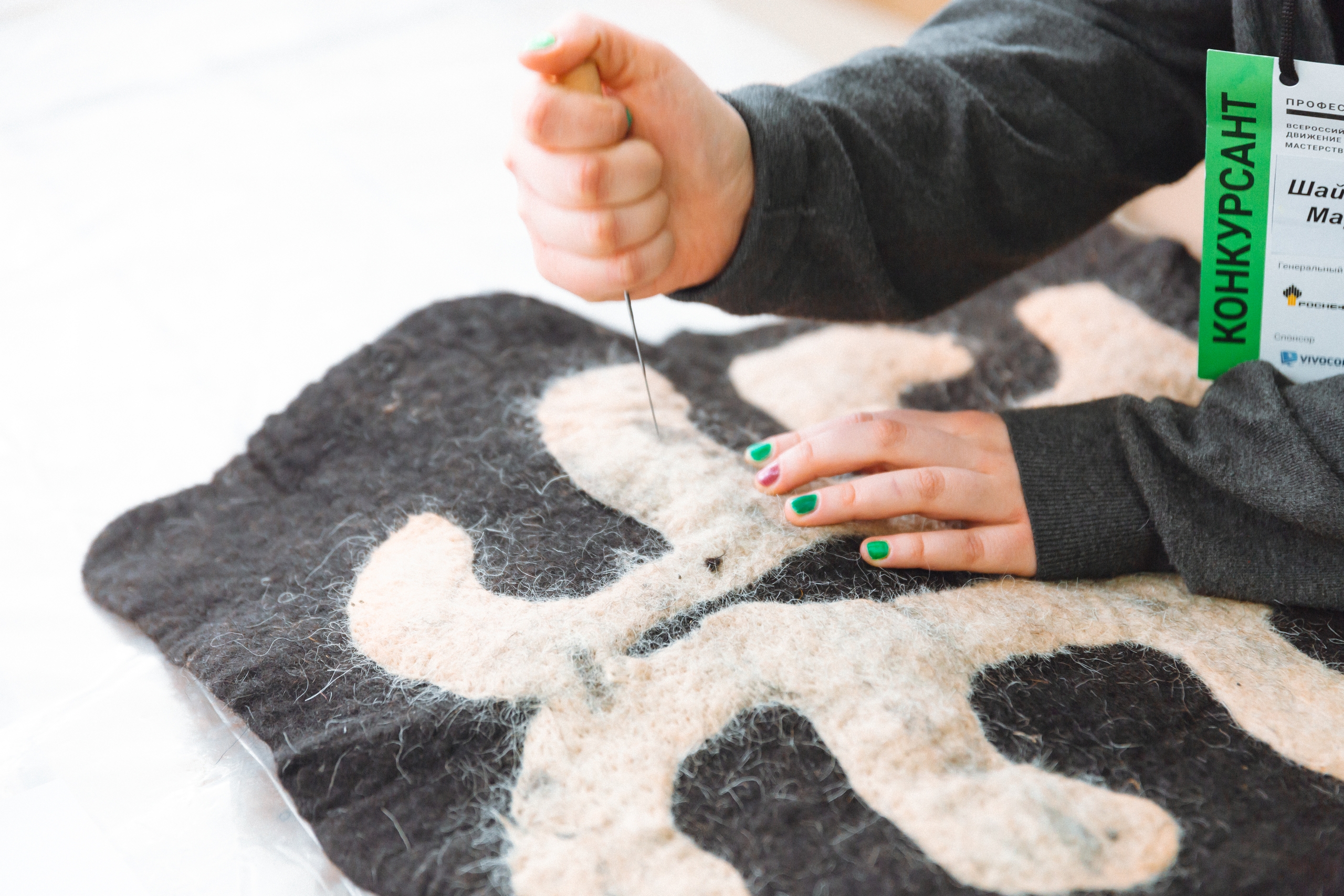 «Я с детства занималась войлоком, ходила вместе  с мамой на разные мастер-классы. И очень рада, что попала на чемпионат по этой компетенции. Готовясь, я смотрела видео, мастер-классы, изучала разные техники работы и пробовала сама применять их дома, самостоятельно. Создавая эскиз, я вдохновлялась башкирскими узорами, орнаментами. И потом воплотила их в коврике, который сделала методом мокрого валяния. В работе с войлоком мне нравится сам процесс, ощущения, которые он дарит. Даже не знаю, как описать их, это надо попробовать!» – рассказала участница чемпионата Ольга Шаверская, студентка 3 курса колледжа БГПУ им. М. Акмуллы.