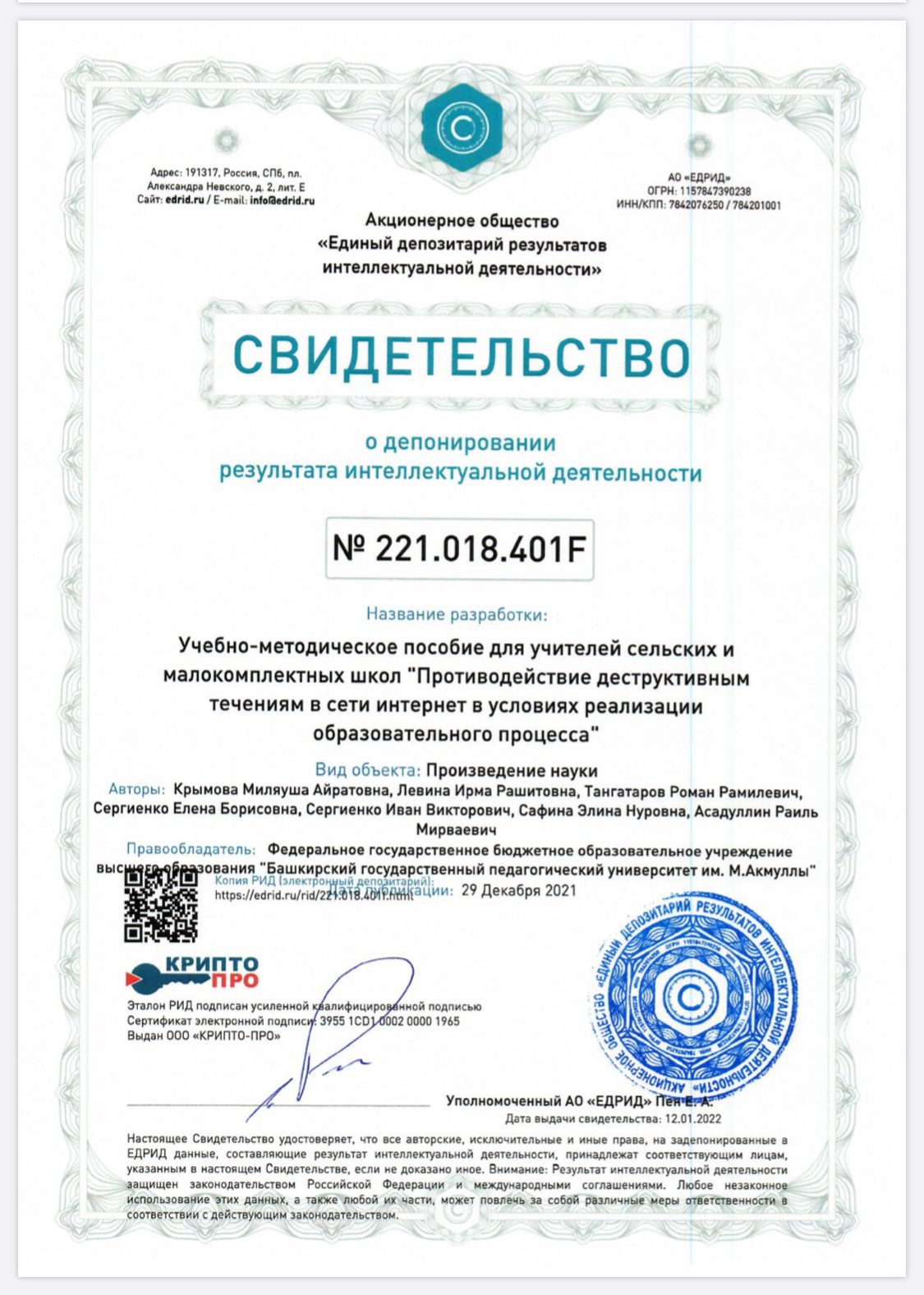 1. «Противодействие деструктивным течениям в сети интернет в условиях реализации образовательного процесса» (авторы: Асадуллин Р.М., Крымова М.А., Левина И.Р., Сергиенко И.В., Сергиенко Е.Б, Сафина Э.Н., Тангатаров Р.Р.). Пособие предоставляет помощь учителям сельских и малокомплектных школ по методам обеспечения безопасности онлайн-занятий, проводимых через Интернет, и обучает их безопасному использованию Интернета в профессиональной деятельности.