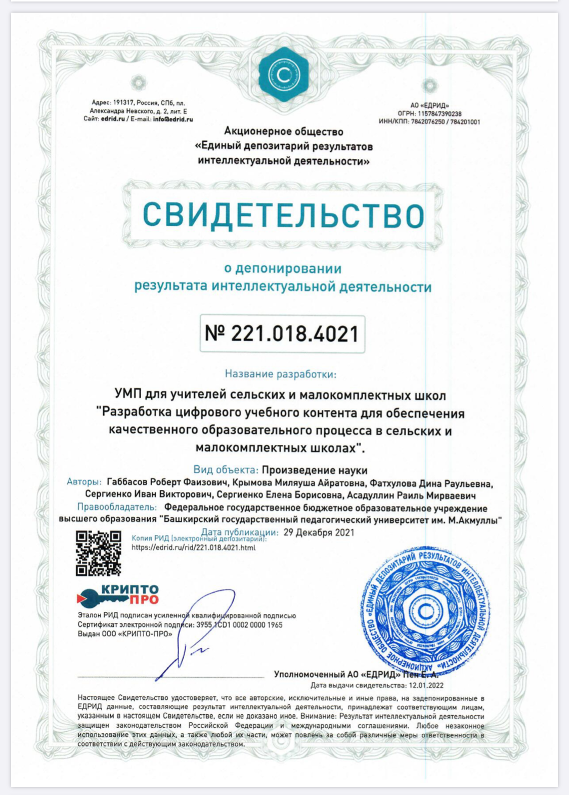 12 января 2022 года НИИ стратегии развития образования получены четыре свидетельства о депонировании результатов интеллектуальной деятельности  по Государственному заданию Министерства просвещения РФ по теме «Исследование и разработка методических рекомендаций по применению современных цифровых и интернет технологий на примере сельских и малокомплектных школ в части обеспечения качественного образовательного процесса».
