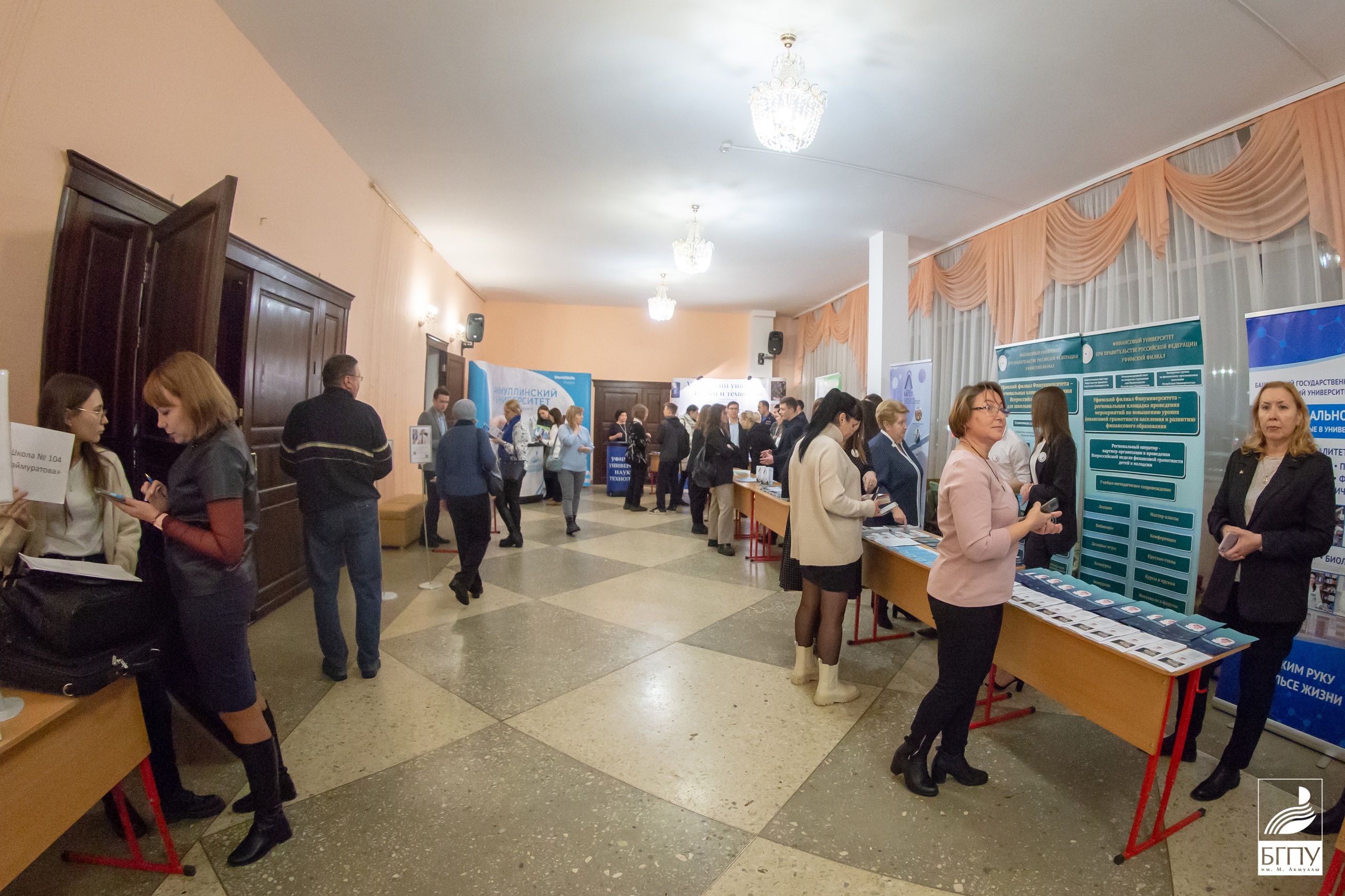 Перед началом встречи в фойе дворца культуры расположились выставочные стенды уфимских высших учебных заведений: УГНТУ, УУНиТ, БГПУ, БГАУ, БГМУ, БАГСУ, УГИИ, УЮИ МВД и Финансового университета, где школьники и их родители могли пообщаться с представителями вузов.