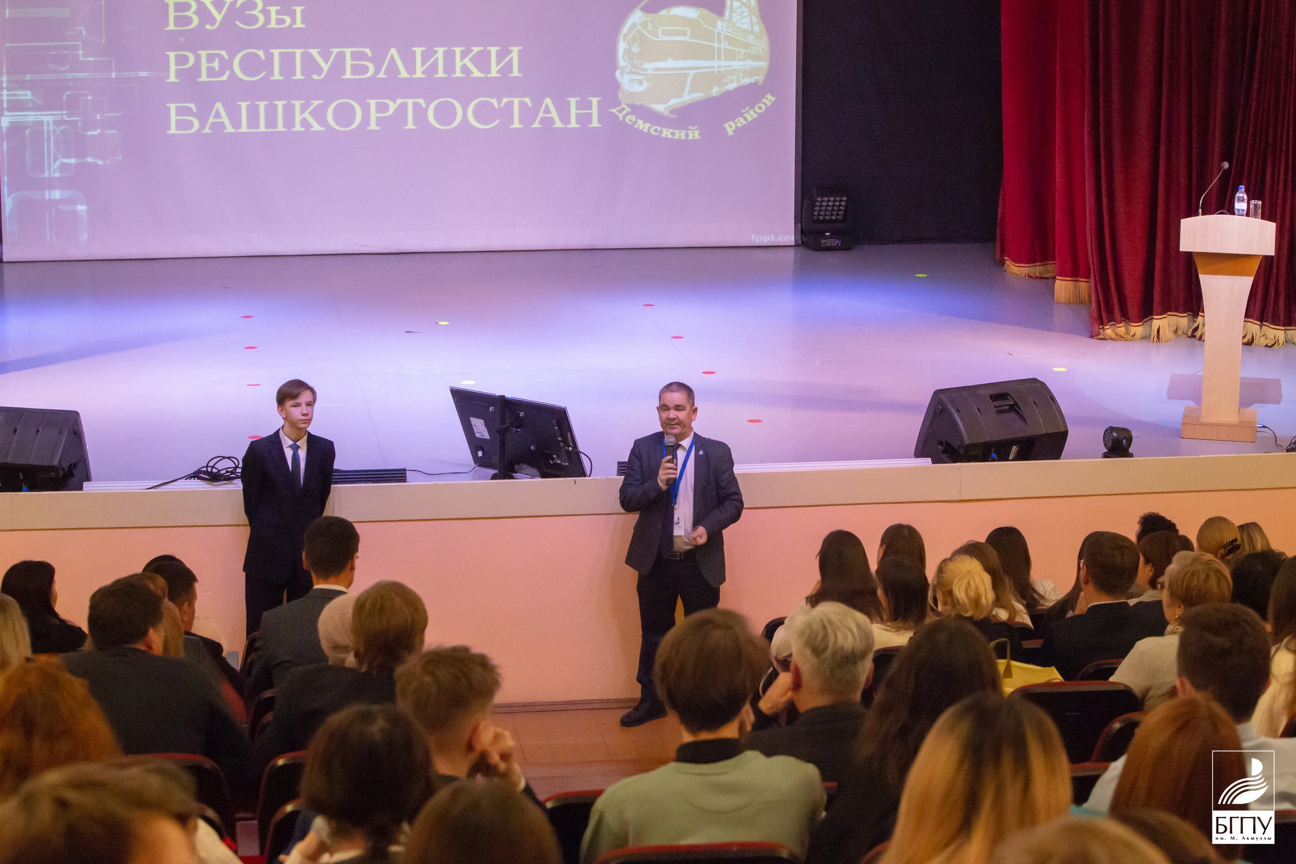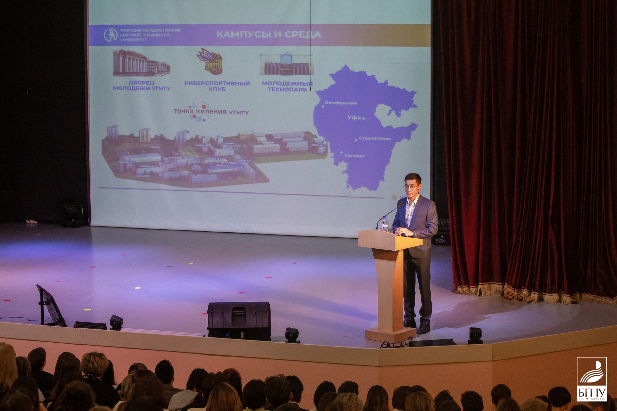 Салават Сагитов представил общую картину системы высшего образования в регионе, обратив внимание аудитории на высокий уровень образования во всех вузах Башкортостана и их востребованность как в регионе, так и за его пределами. Он рассказал о поддержке, которую получают студенты вузов региона, внеучебной деятельности и возможностях трудоустройства после обучения.
