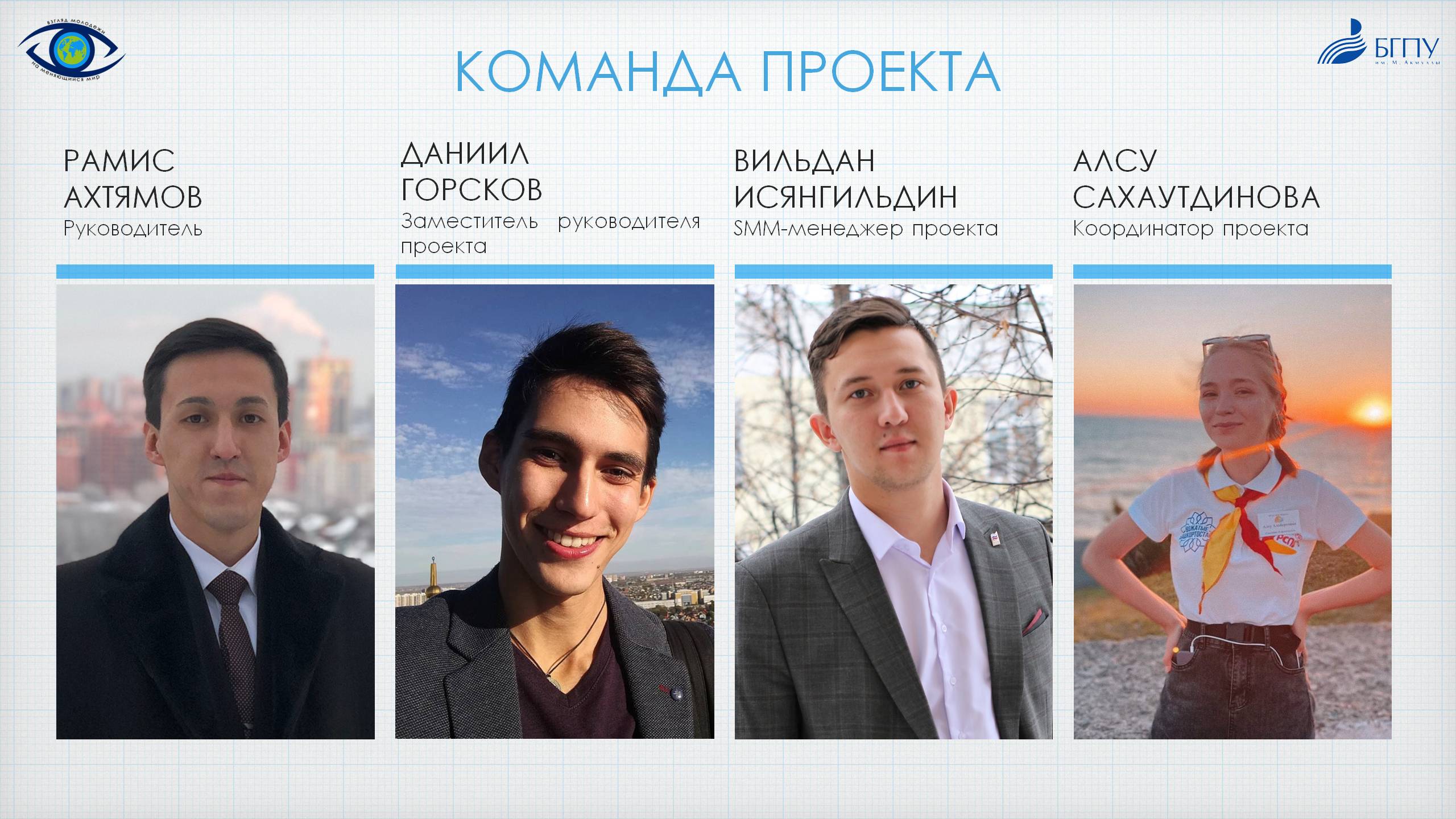 Кафедра обществознания, права и социального управления совместно с Управлением образовательных разработок БГПУ им. М.Акмуллы подготовили заявку на участие в конкурсе Федерального агентства по делам молодежи («Росмолодежь») «на предоставление грантов в форме субсидий из федерального бюджета некоммерческим организациям на реализацию мероприятий по сохранению исторической памяти и гражданскому воспитанию». Ожидается реализация межрегионального молодежного проекта «Взгляд молодежи на меняющийся мир». В состав рабочей группы грантового проекта вошли преподаватели и студенты ИИПСГО.