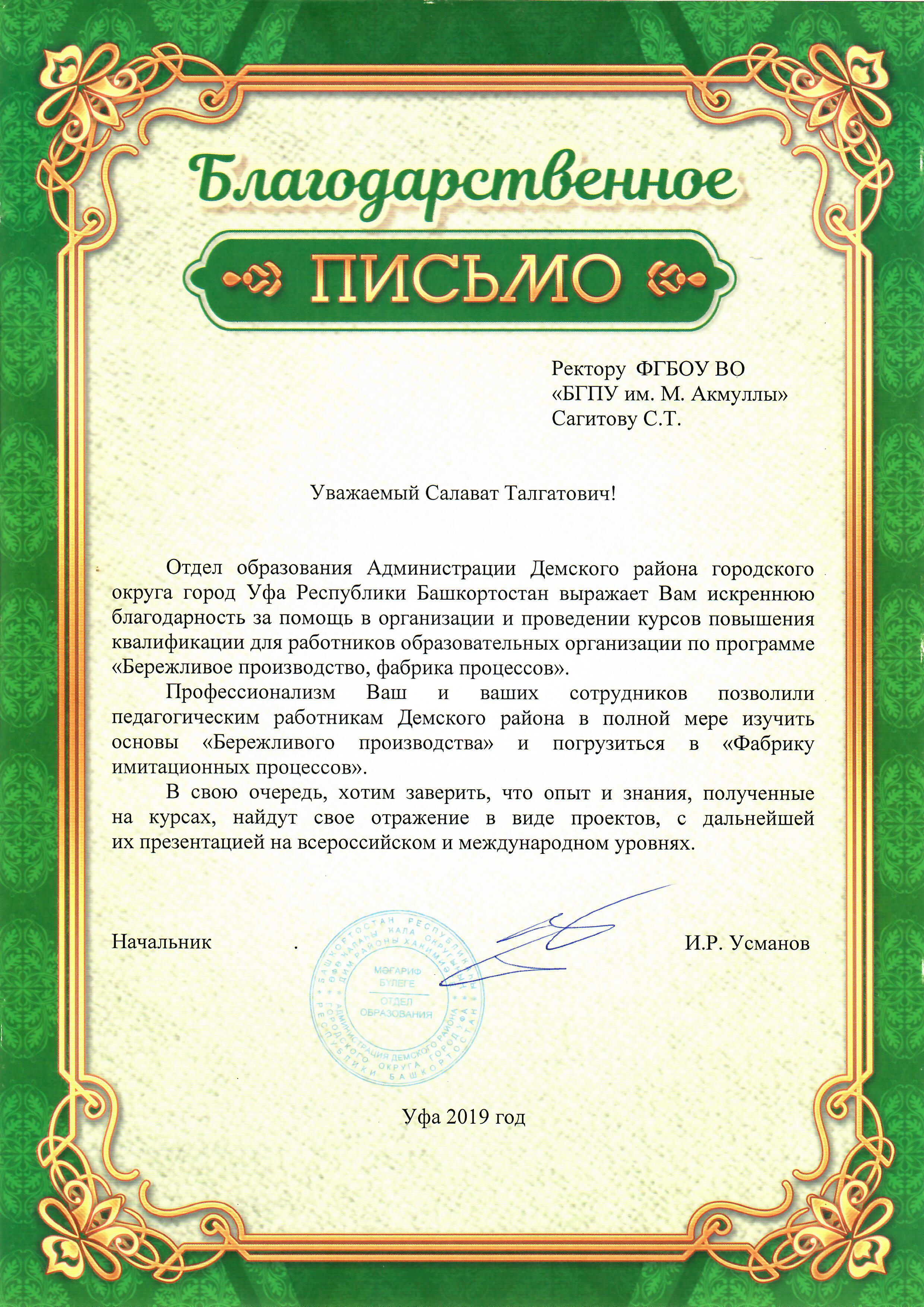 По результатам встречи участников совещания было поддержано предложение БГПУ им М. Акмуллы о заключении Соглашения о сотрудничестве администрации Дёмского района городского округа город Уфа Республики Башкортостан и ФГБОУ ВО «Башкирский государственный педагогический университет им. М. Акмуллы» по сопровождению информационных, консультационных, обучающих и просветительских программ и инновационных проектов, связанных с применением бережливых технологий в практике деятельности муниципальных организаций и учреждений.