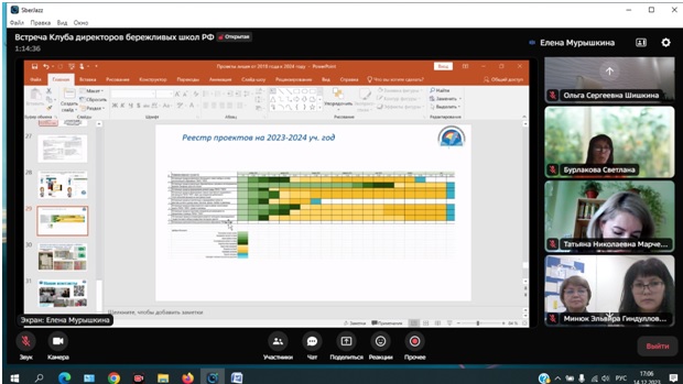 14 декабря 2023г. состоялось заседание  Клуба директоров бережливых школ, где  Давыдова Надежда Станиславовна прокомментировала о методике составления карточек проекта, а представители Клуба рассказали о применении бережливых технологии при организации образовательного процесса. К данному заседанию были подключены директора школ ГО г. Уфа МАОУ «Башкирский лицей №2 им. Г.Г.Ибрагимова», МАОУ «Центр образования №10», МАОУ «Школа № 22», МАОУ «Школа № 41», МАОУ «Башкирская гимназия № 158 им.М.Карима». Представители образовательных организаций совместно с Гульдар Фанисовной, Эльвирой Гиндулловной обозначили темы по реализации проектов с использованием бережливых технологий.