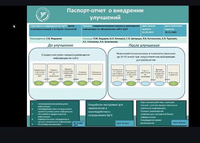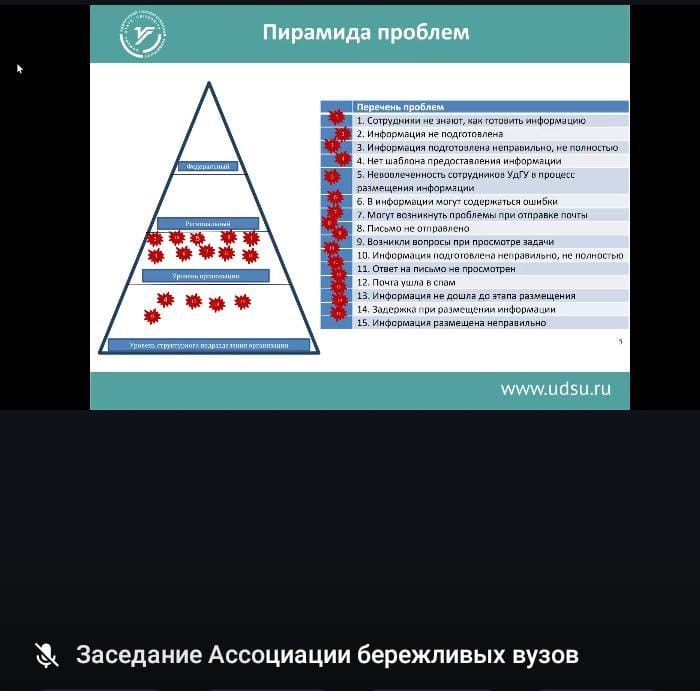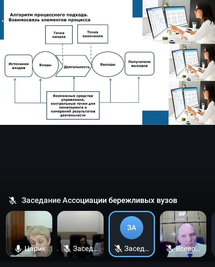Согласно повестке вступительным словом приветствовал участников заседания председатель Ассоциации бережливых ВУЗов, ректор ФГБОУ ВО КубГМУ Минздрава России Алексеенко Сергей Николаевич; координатор Ассоциации бережливых ВУЗов, руководитель проектов АО «Производственная система Росатом» Давыдова Надежда Станиславовна. В ходе онлайн-семинара были заслушаны готовые к тиражированию образцы: ФГБОУ ВО «Кемеровский государственный медицинский университет»: «Использование объемно-пространственного изображения в структуре медицинских организаций в образовательном процессе» (докладчик: Царик Галина Николаевна доктор медицинских наук, профессор, заведующий кафедрой общественного здоровья, организацией и экономики здравоохранения); ФГБОУ ВО «Удмуртский государственный университет»: «Совершенствование процесса размещения информации на официальном сайте УдГУ» (докладчик: Плетнева Татьяна Викторовна, к.э.н., доцент кафедры государственной службы и управления персоналом), также планируемые к запуску проекты:  ФГБОУ ВО «Нижегородский государственный инженерноэкономический университет» Министерства образования и науки Нижегородской области: «Врач на несколько больниц» (докладчик: к.э.н., доцент Екатерина Николаевна Зубенко); ФГБОУ ВО «Приволжский исследовательский медицинский университет» Министерства здравоохранения Российской Федерации: «Учебная аптека с производственной функцией» (докладчик: Пономарева Алена Анатольевна, к.ф.н., доцент кафедры управления и экономики фармации и фармацевтической технологии); ФГБОУ ВО «Волгоградский государственный медицинский университет» Министерства здравоохранения Российской Федерации: «Повышение экономической эффективности проектов по улучшениям» (докладчик: Аджиенко Всеволод Леонидович, руководитель проектного офиса, доктор медицинских наук).