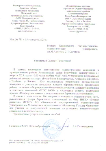 21 августа 2025г. Ибрагимова Гульдар Фанисовна (к.п.н., руководитель Центра бережливых компетенций на базе ИНПО «Вектор развития» ФГБОУ ВО «Башкирский государственный педагогический университет им. М. Акмуллы») приняла участие в августовском педагогическом совещании в муниципальном районе Аургазинский район Республики Башкортостан в качестве спикера со следующими темами доклада: «Формирование бережливой личности младшего школьника в контексте изменений ФГОС НОО» и «Ключевые аспекты реализации проекта «Комфортная школа» с использованием бережливых технологий».