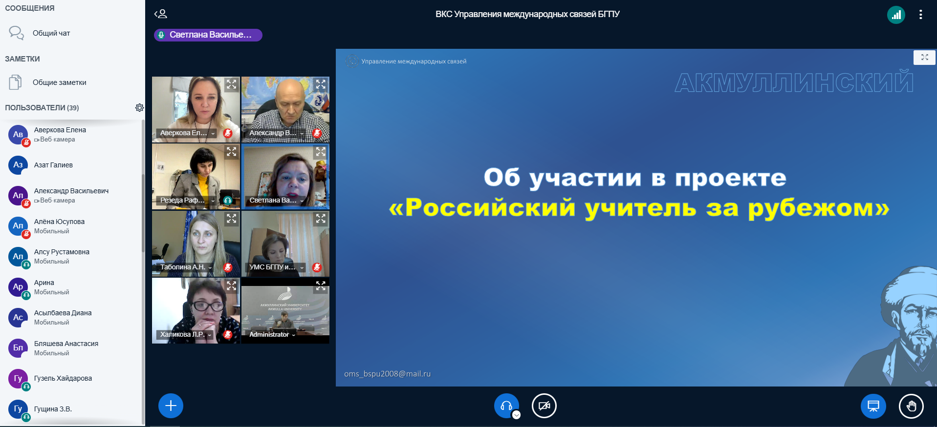 В своем выступлении начальник УМС рассказала о работе, проделанной в рамках регистрации кандидатов из числа выпускников БГПУ им. М.Акмуллы на квоту Правительства РФ, деталях регистрации на сайте и реализации двудипломной магистратуры в рамках УШОС совместно с вузами-партнерами.