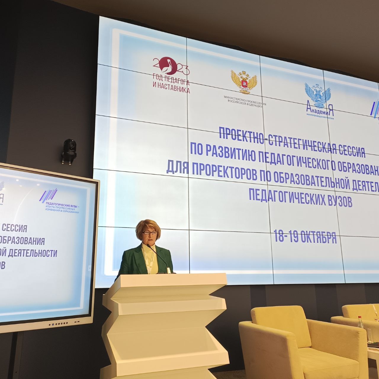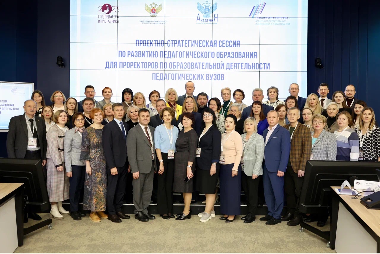 В Академии Минпросвещения России 18-19 октября состоялась проектно-стратегическая сессия по развитию педагогического образования. Участниками ее стали проректора по образовательной деятельности педагогических вузов. В пленарной части приняли участие директор Департамента подготовки, профессионального развития и социального обеспечения педагогических работников Минпросвещения Павел Кузьмин, проректор Академии Минпросвещения Хож-Ахмед Халадов, начальник управления взаимодействия с педвузами Инна Головина, ведущий эксперт академии Ольга Серебрянникова, представитель Рособрнадзора Ольга Якимчук