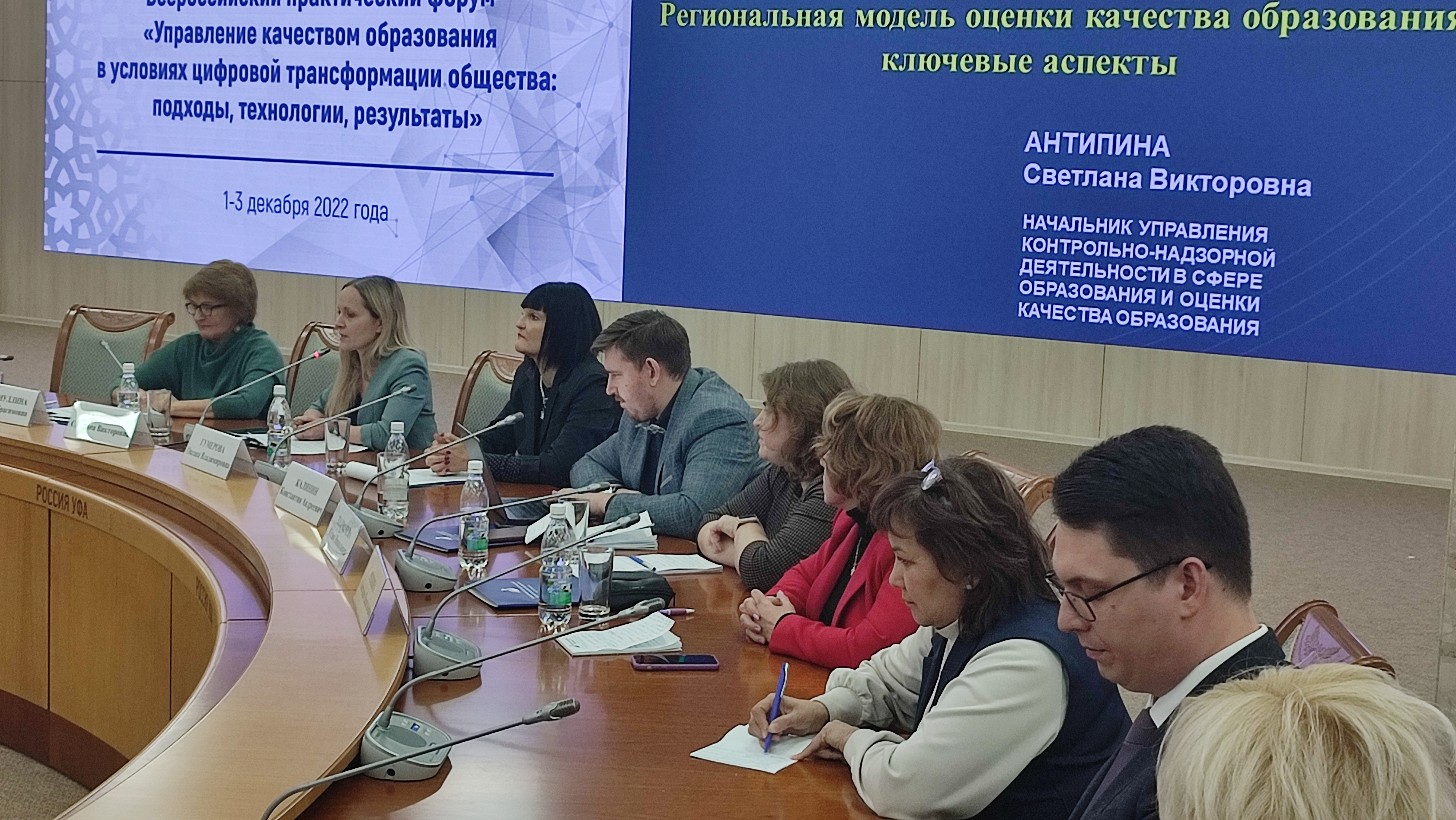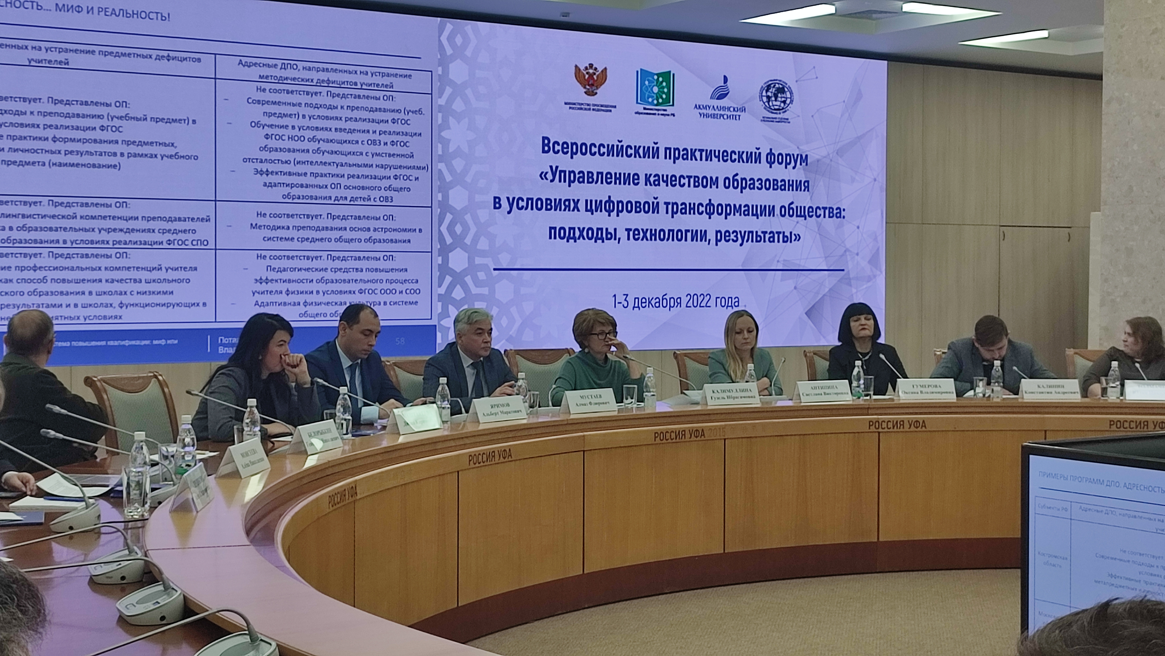 Директор ФГБУ «Федеральный центр тестирования» Юлия Егорова рассказала о технологиях и инструментарии оценки компетенций и выявления профессиональных дефицитов педагогов и студентов. Советник руководителя Федеральной службы по надзору в сфере образования и науки, проректор по образовательной деятельности ФГАОУ ВО «Южно-Уральский государственный университет (национальный исследовательский университет)» Марина Потапова ознакомила с основными результатами оценки ИКТ-компетенций. Диана Маштакеева, член Правления РСПП, генеральный директор совета по профессиональным квалификациям Финансового рынка, ознакомила присутствующих с выстроенной системой работы по оцениванию профессиональных компетенций, которое приводит к повышению профессиональной квалификации.  Геннадий Белорыбкин, ректор АОУ ДПО «Институт регионального развития» Пензенской области, доктор исторических наук, профессор, Советник губернатора Пензенской области, рассказал о трендах развития электронной системы образования области. Одним из направлений управления качеством образования является работа со школами с низкими образовательными результатами. На сегодняшний день высокое качество образования проявляется не только в высоких достижениях отдельных образовательных организаций, но и в большом разбросе в результатах между «слабыми» и «сильными» школами. Чем меньше такой разброс, тем в большей степени можно говорить о выравнивании их образовательных возможностей. Сопровождение школ с низкими образовательными результатами на федеральном уровне осуществляется в рамках проекта «500+». Но к участию в проекте привлекается только 10-20% школ региона, поэтому повышение качества образования в таких школах во многом определяется выстроенной региональной системой сопровождения этих школ. О механизмах сопровождения образовательных организаций с низкими образовательными результатами обучающихся в Республике Башкортостан рассказала начальник управления контрольно-надзорной деятельности в сфере образования и оценки качества образования Светлана Антипина. На панельной дискуссии также выступили: Худякова А.В., доцент кафедры физики и технологии ФГБОУ ВО «ПГГПУ», к. п. н., федеральный эксперт программ дополнительного профессионального (педагогического) образования, председатель Пермского регионального отделения Общероссийской общественной организации доказательного развития образования («Модель оценки ИКТ-компетенций педагогических работников»); Репина А.В., руководитель научно-методического центра сопровождения педагогических работников «Центр трансфера образовательных технологий «Новая дидактика» ФГБОУ ВО «Ярославский государственный педагогический университет им К. Д. Ушинского» («Векторы взаимодействия субъектов Единой федеральной системы научно-методического сопровождения педагогических работников: опыт и перспективы»); Моисеева А.Н., доцент кафедры дошкольного, коррекционного, дополнительного образования и проблем воспитания ФГБОУ ВО «Оренбургский государственный педагогический университет» («Вовлеченность родителей в образовательный процесс школы как условие повышения качества образования»);  Толмачева Ю.Н., доцент кафедры специальной (коррекционной)  педагогики и психологии ФГБОУ 