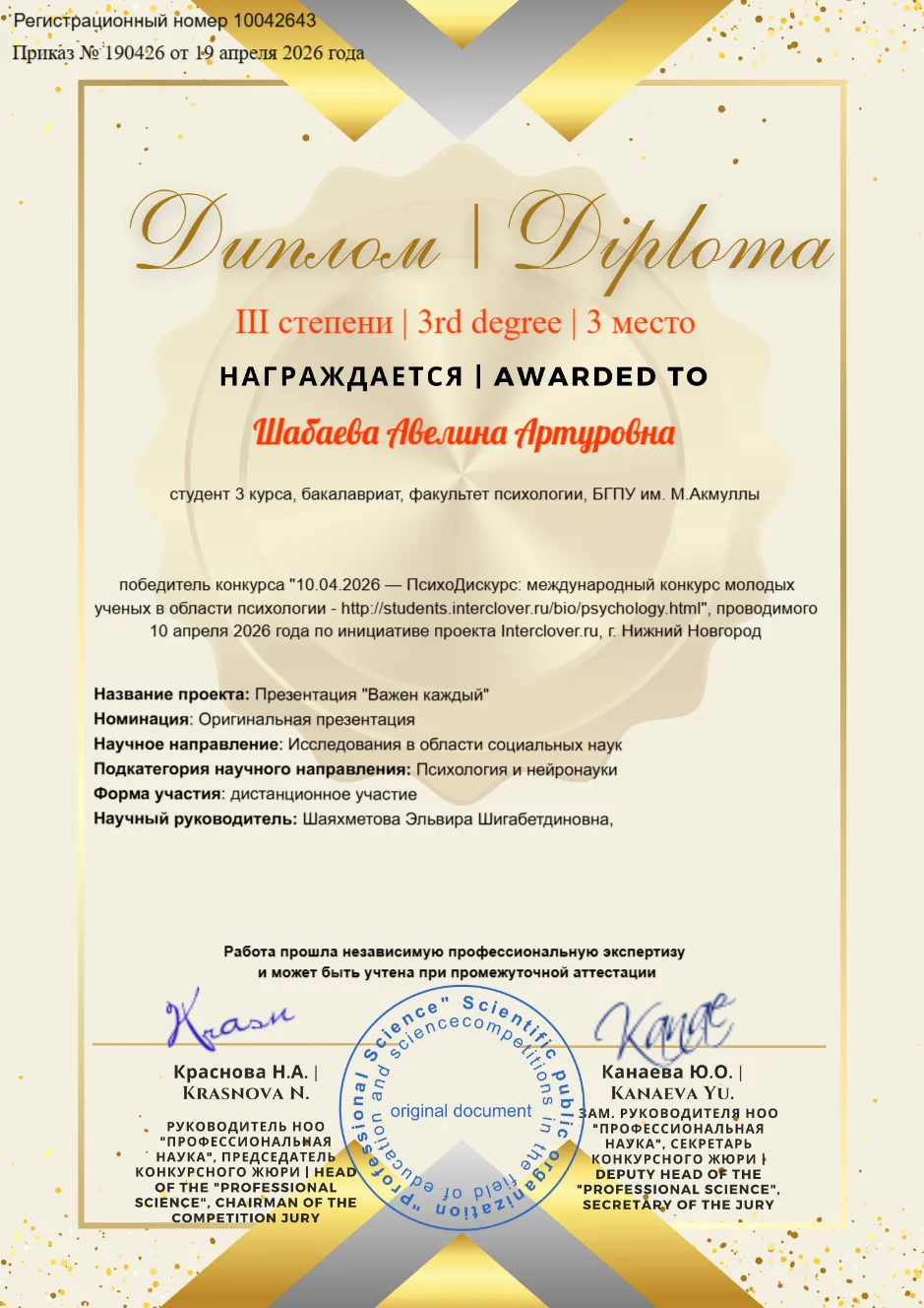 Студентка факультета психологии Авелина Шабаева в международном конкурсе молодых ученых "ПсихоДискус 2026" заняла почетное III место