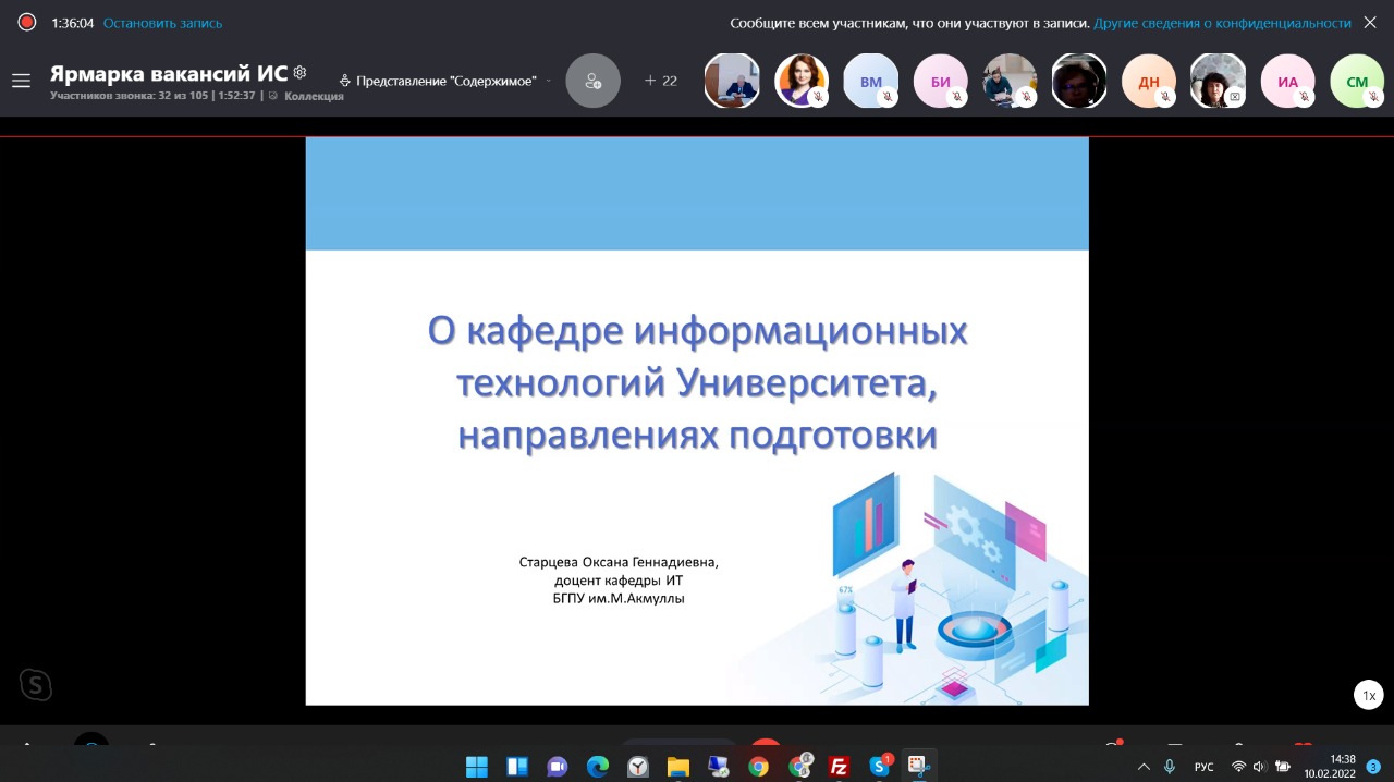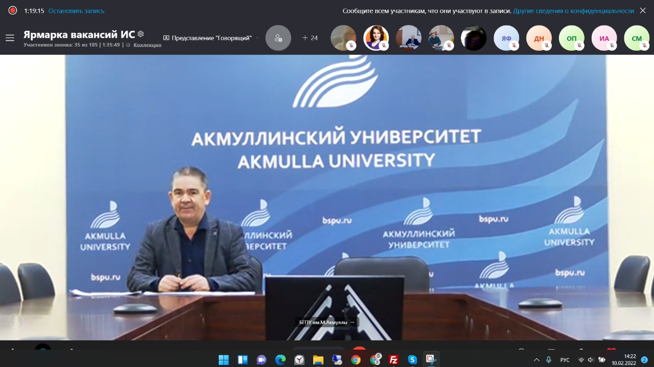 10.02.2022 г. в формате ВКС Уфимский государственный колледж технологии и дизайна организовал «Ярмарку вакансий» для студентов выпускных групп специальностей Информационные системы (по отраслям) и Информационные системы и программирования. Главный специалист отдела профессиональной ориентации ГКУ Центр занятости населения г. Уфы обрисовала ситуацию на рынке труда РБ и востребованность выпускников ИТ-специальностей. В мероприятии приняли участие представители 14 организаций, среди АО «Форт диалог», ГУП Центр ИКТ РБ, ООО «СберМедИИ», АО «Уфанет», ПАО «Ростелеком», ООО «МЕТТА», АНО «Школа 21» г. Москва и другие. Представители организаций  рассказали о своих предприятиях и обозначили требования к персоналу. В числе приглашенных докладчиков были и представители БГПУ им.М.Акмуллы: директор профориентационного центра Тимерханов Фидонис Фанавиевич рассказал о нашем Университете в целом, правилах приема 2022 года, а доцент кафедры Информационных технологий Старцева Оксана Геннадиевна - о деятельности кафедры и технических направлениях подготовки (Информационные системы и технологии, Прикладная информатика), которые она реализует.