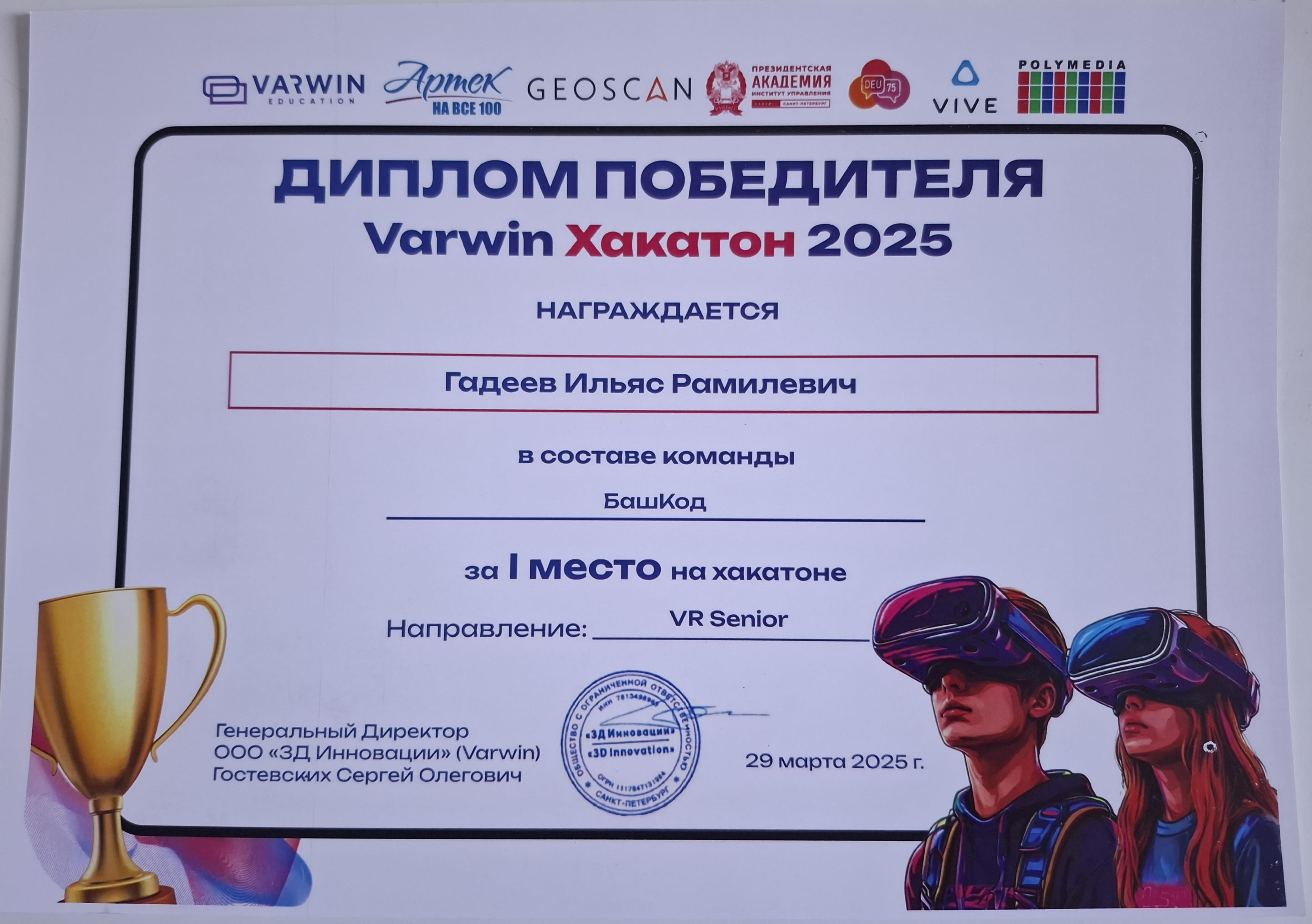 Всероссийский хакатон по 3D/VR-разработке «Varwin Хакатон 2025» – это бесплатное соревновательное мероприятие, нацеленное на работу с учащимися общеобразовательных учреждений Российской Федерации. Хакатон носит просветительский характер и ориентирован на повышение мотивации к научно-техническому творчеству, цифровым технологиям в образовательном процессе, в частности, инструментов для работы в виртуальной реальности. Дополнительная информация о Хакатоне доступна на сайте https://hackathons.varwin.com.