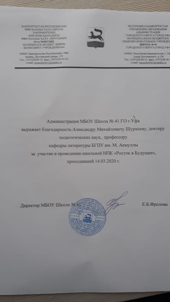 14 марта в рамках изучения дисциплин «Теория и методика обучения русскому языку» и «Теория и методика обучения русской литературе» студенты 4 курса направления подготовки 44.03.05 Педагогическое образование, направленности (профиля) "Русский язык и литература" под руководством преподавателей кафедр русского языка к.ф.н., доц. О.В. Тугузбаевой и русской литературы  д.п.н., проф. А.М. Шуралёва приняли активное участие в организации и проведении научно-практической конференции "Росток в будущее" для учащихся 1-11 классов в МБОУ СОШ № 41 г. Уфа. Студенты приняли участие в работе 7 секций в качестве ведущих, членов жюри, провели викторины, конкурсы, квесты по русскому языку и литературе. Также в рамках программы дня науки и культуры профессор кафедры русской литературы, член Союза писателей России и Башкортостана А.М. Шуралёв по просьбе администрации школы провёл творческую встречу с учениками 9-11 классов, во время которой исполнил свои стихи и песни о родителях, детстве, отчем доме, Великой Отечественной войне, поэтах, поэзии, любви и пригласил выпускников поступать в БГПУ им. М. Акмуллы.