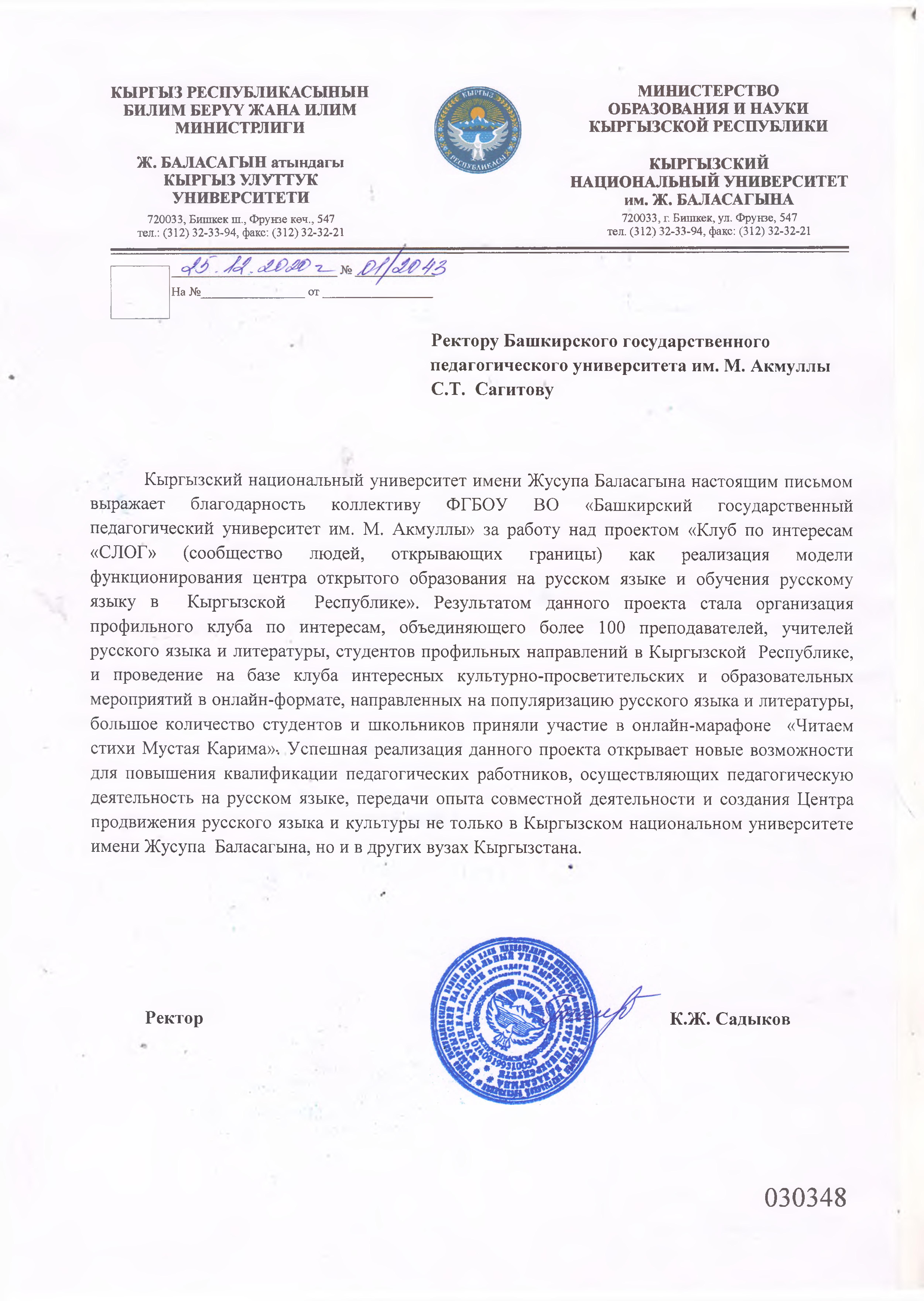 Кыргызский национальный университет им. Ж. Баласагына направил благодарность коллективу Башкирского государственного педагогического университета им. М. Акмуллы за работу над проектом «Клуб по интересам «СЛОГ» (Сообщество Людей, Открывающих Границы) как реализация модели функционирования центра открытого образования на русском языке и обучения русскому языку в Кыргызской Республике».