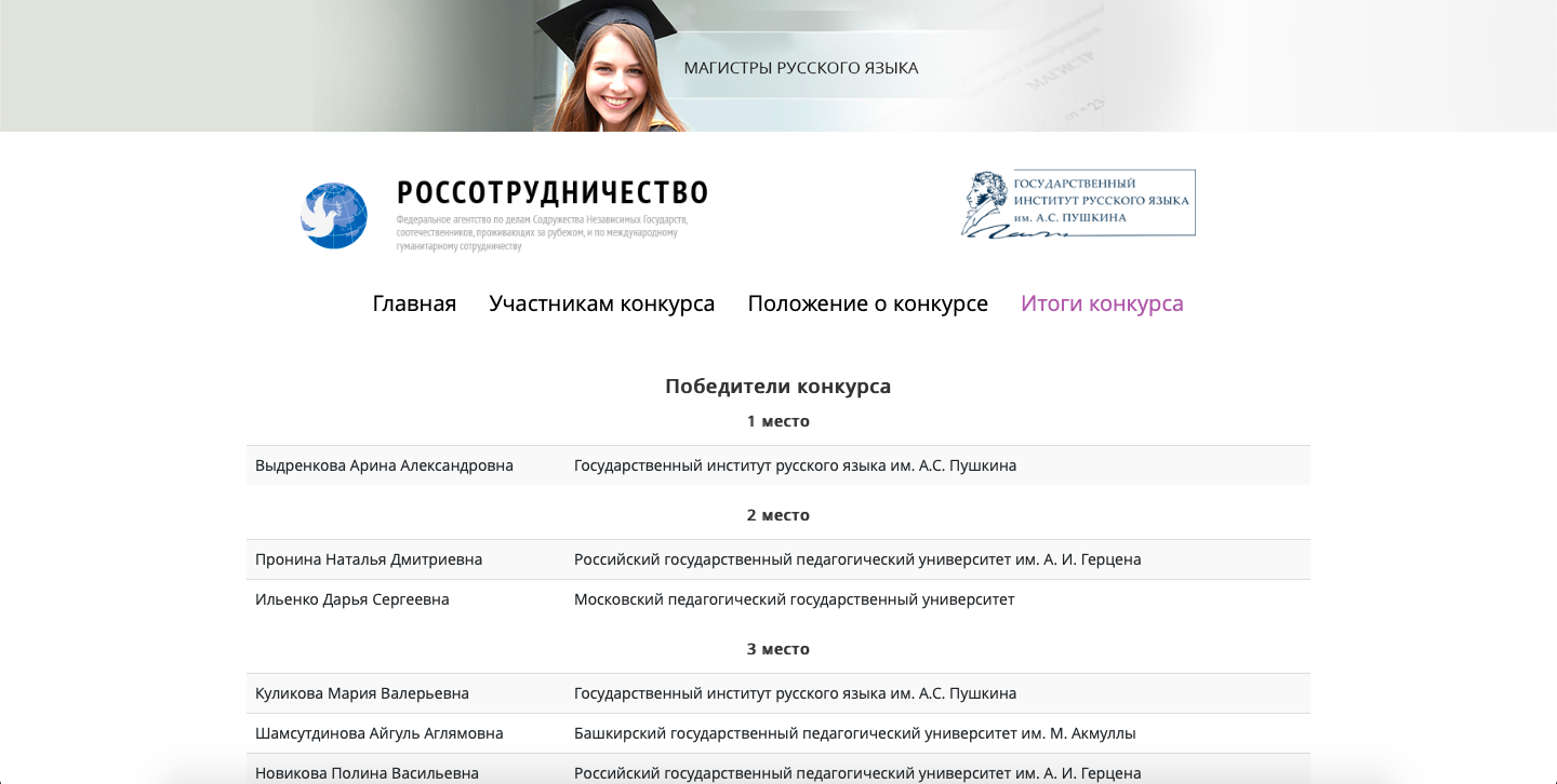 В 2020 году Россотрудничество, Государственный институт русского языка им. А.С. Пушкина, Экспертно-консультационный совет по образованию и науке реализовали Всероссийский проект «Магистры русского языка». В рамках проекта на конкурсной основе из большого количества участников были отобраны лучшие кандидаты из числа магистров и аспирантов, обучающиеся по программам подготовки в области преподавания русского языка как иностранного, а также программам подготовки филологов и учителей русского языка.