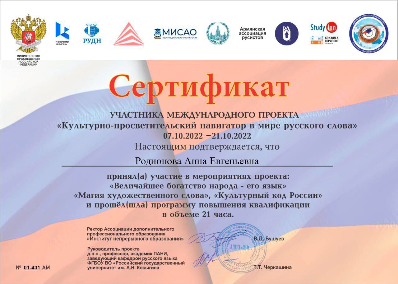 Доцент кафедры русского языка, теоретической и прикладной лингвистики А.Е. Родионова приняла участие в Международном проекте Министерства просвещения РФ «Культурно-просветительский навигатор в мире русского слова».