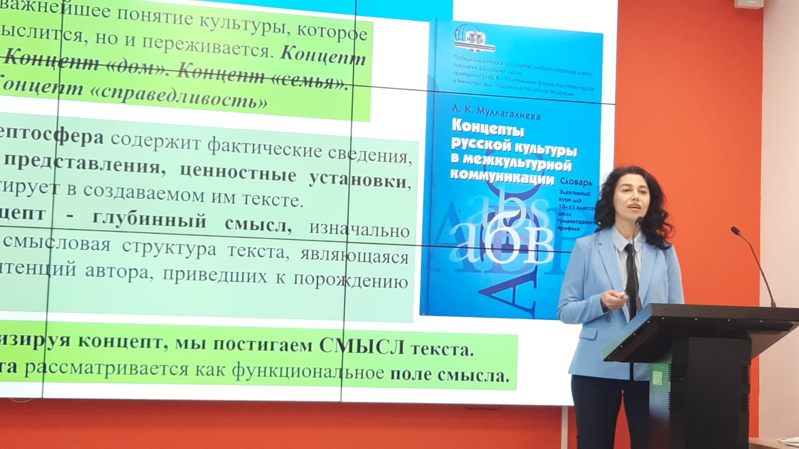 На примере метапредметного концепта «цвет» Лилия Канафовна показала приемы погружения в художественный текст как выражение картины мира писателя, систему его ценностей. Изучение концепта «цвет» позволяет объединить содержание разных учебных предметов и получить метапредметные результаты: языковая личность осознает любовь к русскому слову, усваивает достижения России в художественном слове, живописи, музыке. Большое внимание в мастер-классе было уделено принципу диалога культур в преподавании русского языка. Докладчик вовлекла слушателей в интересный разговор об отражении цветовой картины мира в русской фразеологии, произведениях Ивана Бунина, Федора Абрамова, Владимира Набокова, Дмитрия Лихачева, Ильи Ильфа и Евгения Петрова, Франка Павлоффа, Рэя Брэдбери, Ангама Атнабаева, Алима Кешокова.