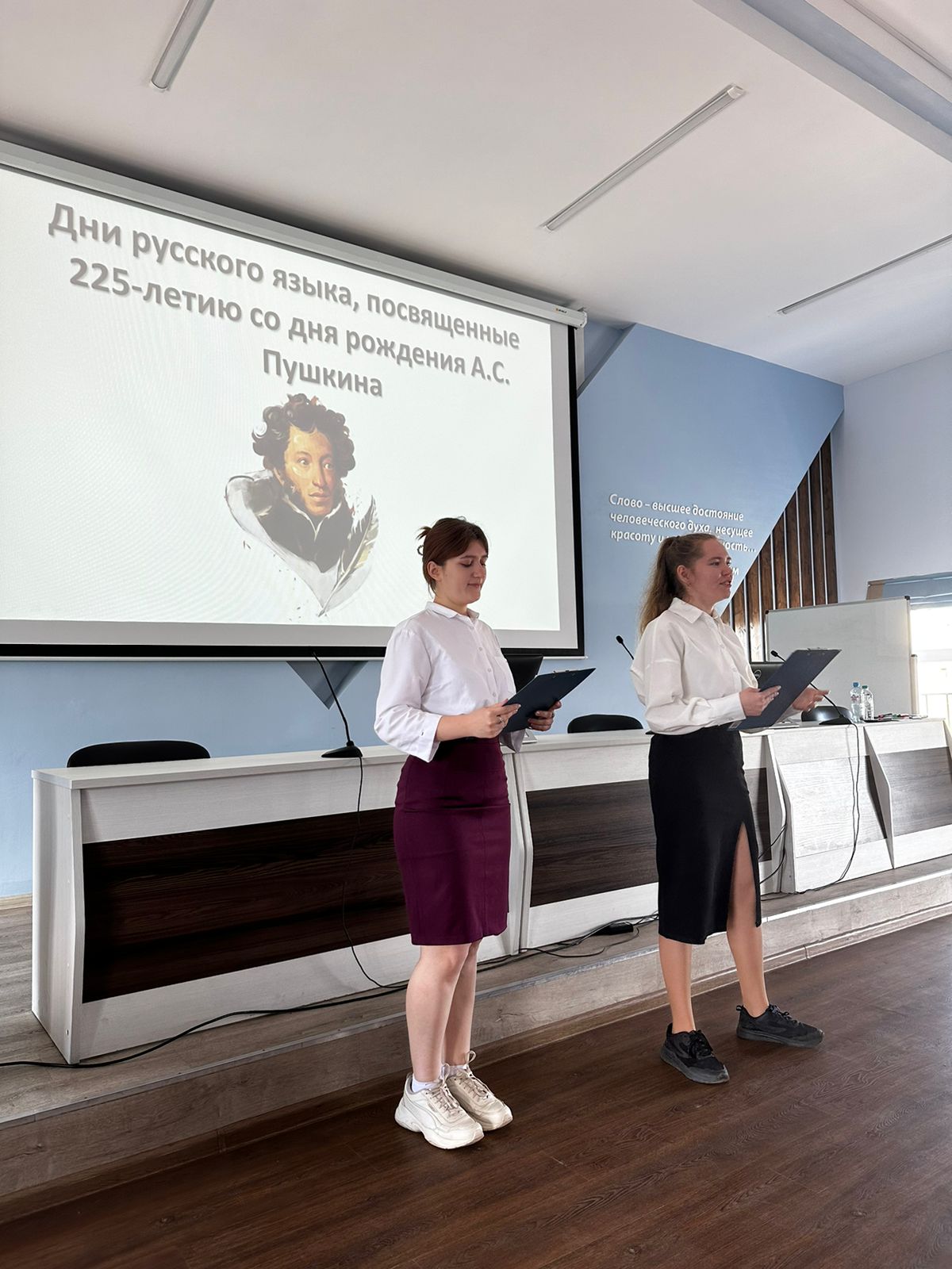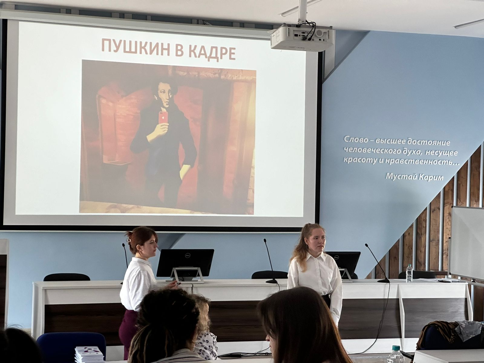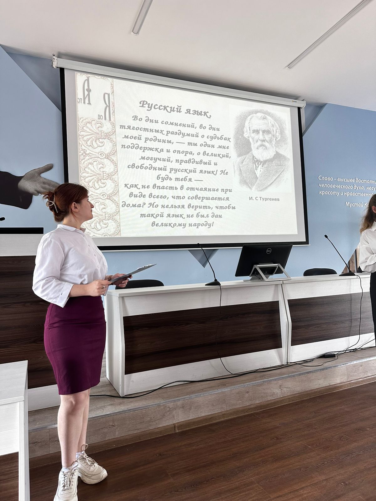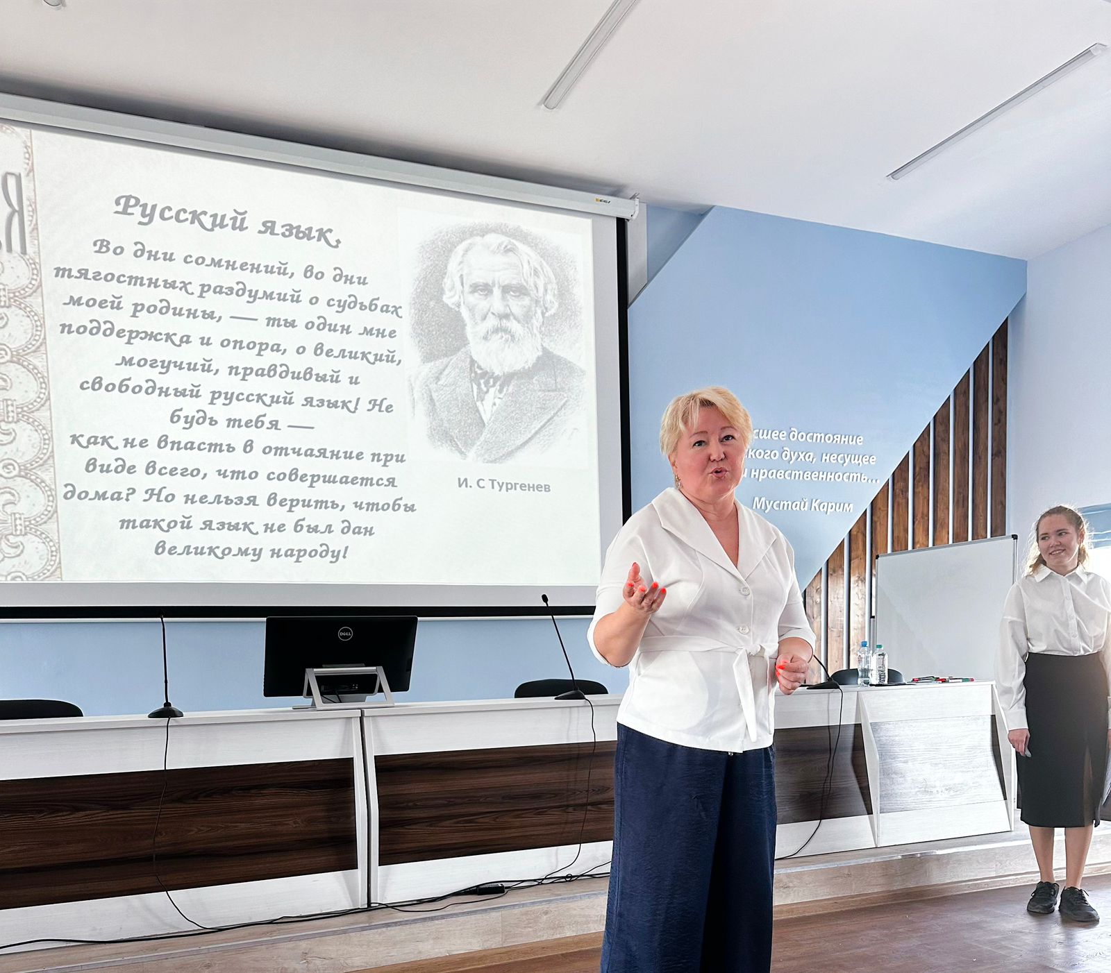 Открыла мероприятие заведующая кафедрой русского языка, теоретической и прикладной лингвистики  Гульнара Кудинова. Она напомнила о необходимости изучения русского языка и литературы, отметила важность продвижения русского языка в зарубежных странах, рассказала о программах языковой стажировки за рубежом.