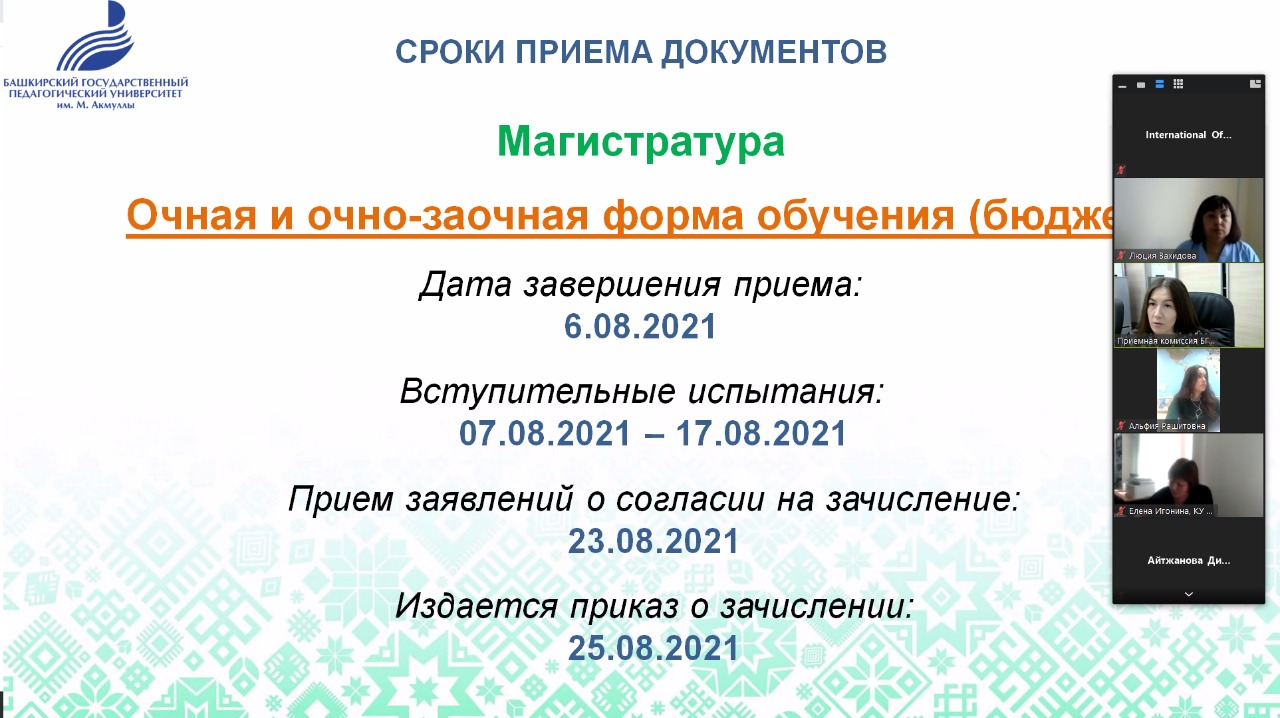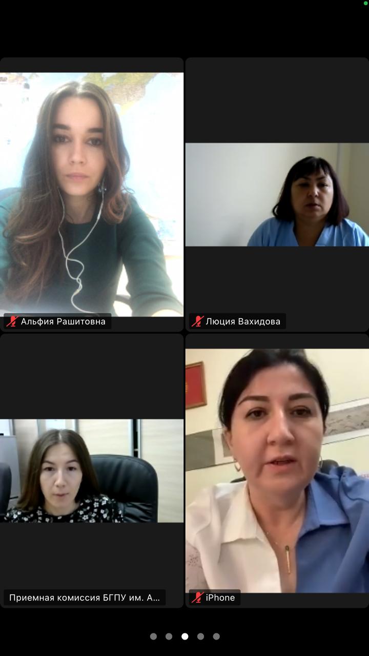 Сегодня состоялось зум-совещание с Кокшетауским университетом им. Мырзахметова (Республика Казахстан). В рабочем совещании приняли участие заведующая сектором внеучебной и визово-регистрационной работы Управления международных связей БГПУ им.Акмуллы - Альфия Бисенгулова, заместитель ответственного секретаря приемной комиссии БГПУ им.Акмуллы Зульфия Зинурова, и.о. заведующего кафедрой профессионального и социального образования Люция Вахидова и абитуриенты Кокшетауского университета. На повестке дня рассматривались вопросы, связанные с приемом студентов на 2021-2022 уч.год, финансирование обучения и условия обмена студентами по программам бакалавриата и магистратуры. По многим вопросам было достигнуто соглашение, акценты были расставлены на профориентационной работе с абитуриентами вузов-партнеров.