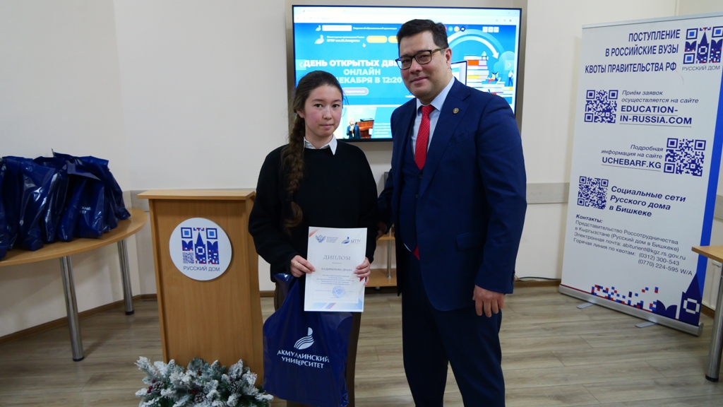 Одним из ключевых событий визита стало награждение участников Акмуллинской олимпиады по русскому языку для граждан Кыргызской Республики в 2024 году. Победители олимпиады рекомендованы к участию в конкурсе на поступление в Акмуллинский университет на бюджетной основе. Мероприятие прошло на площадке Представительства Россотрудничества в Кыргызской Республике.