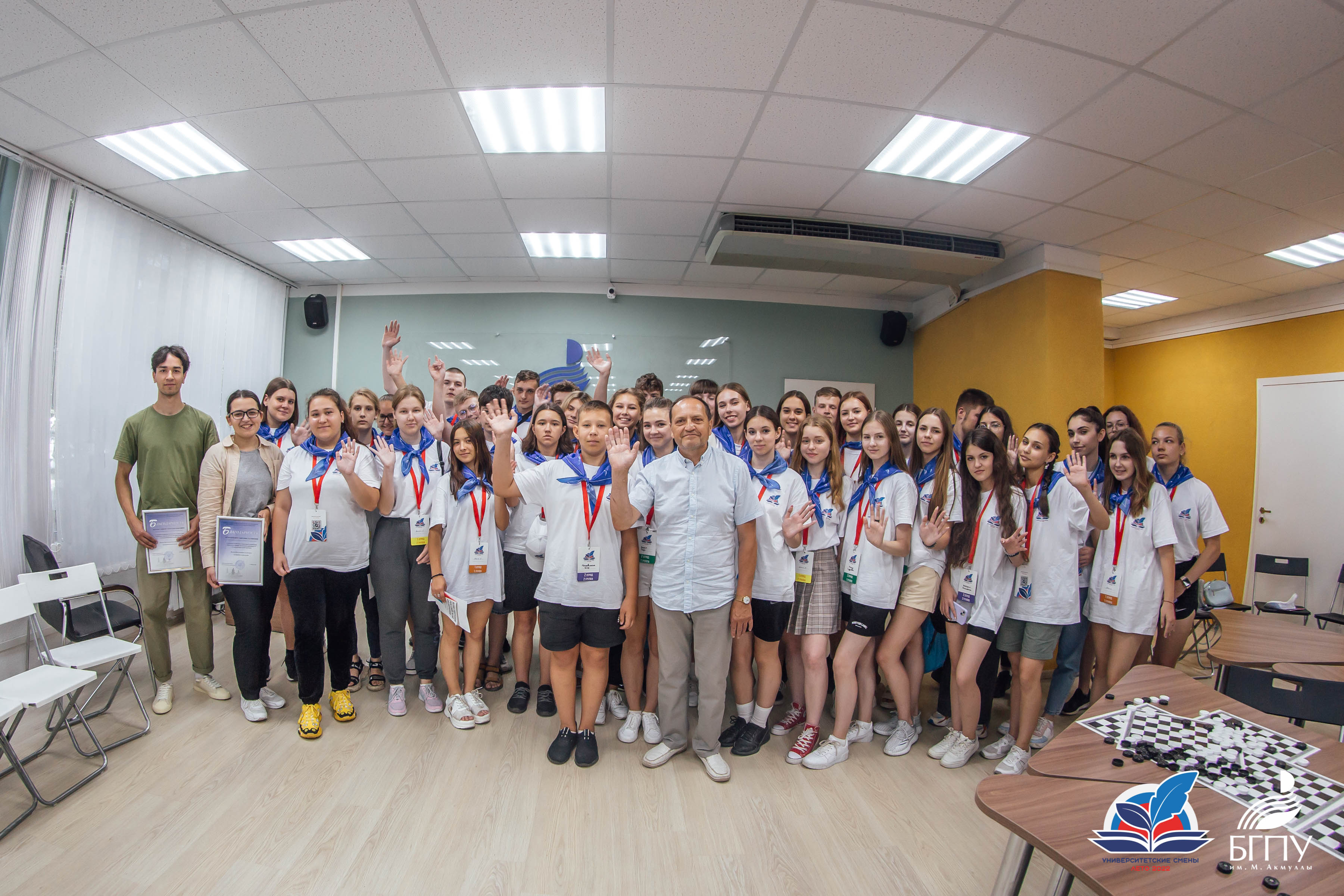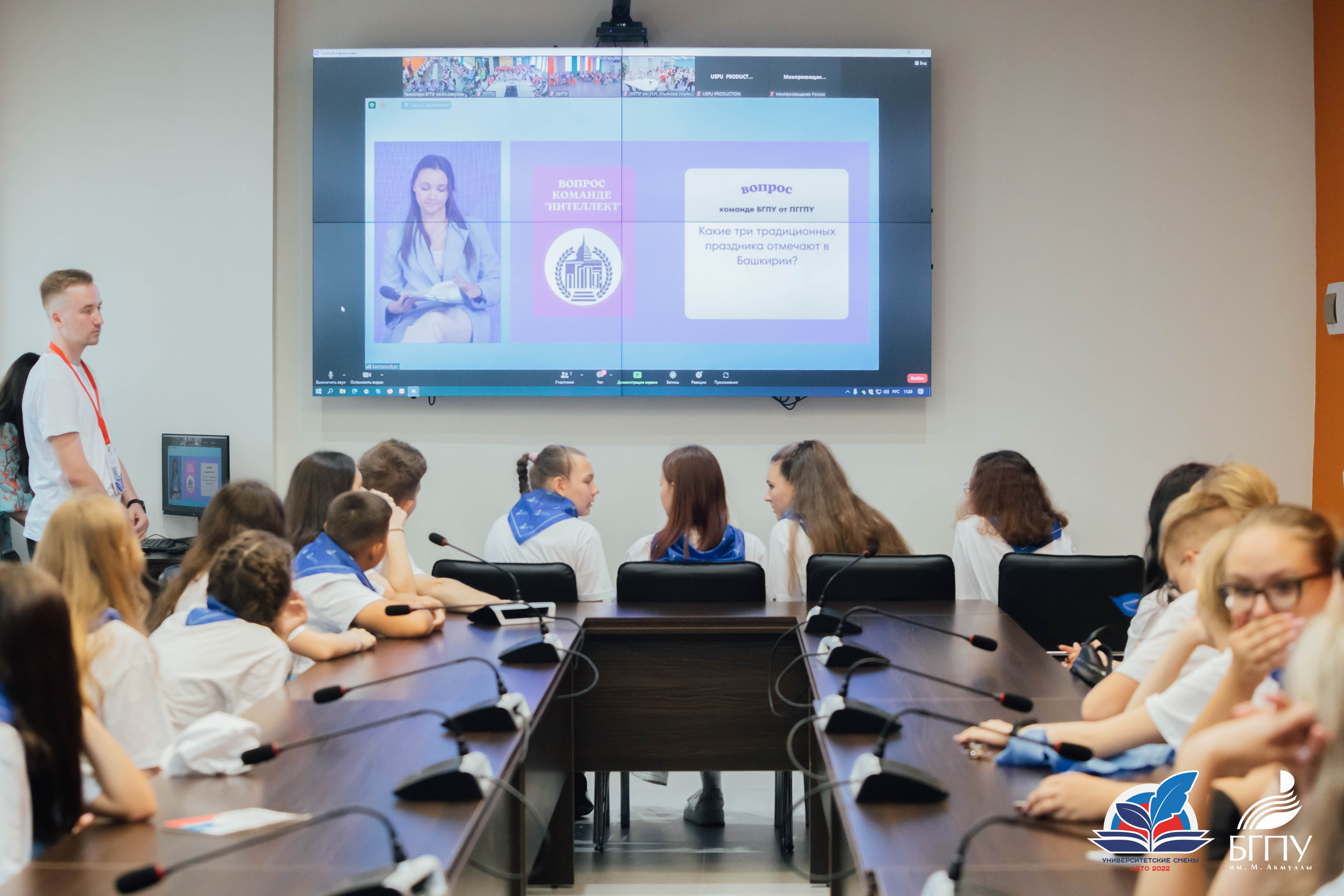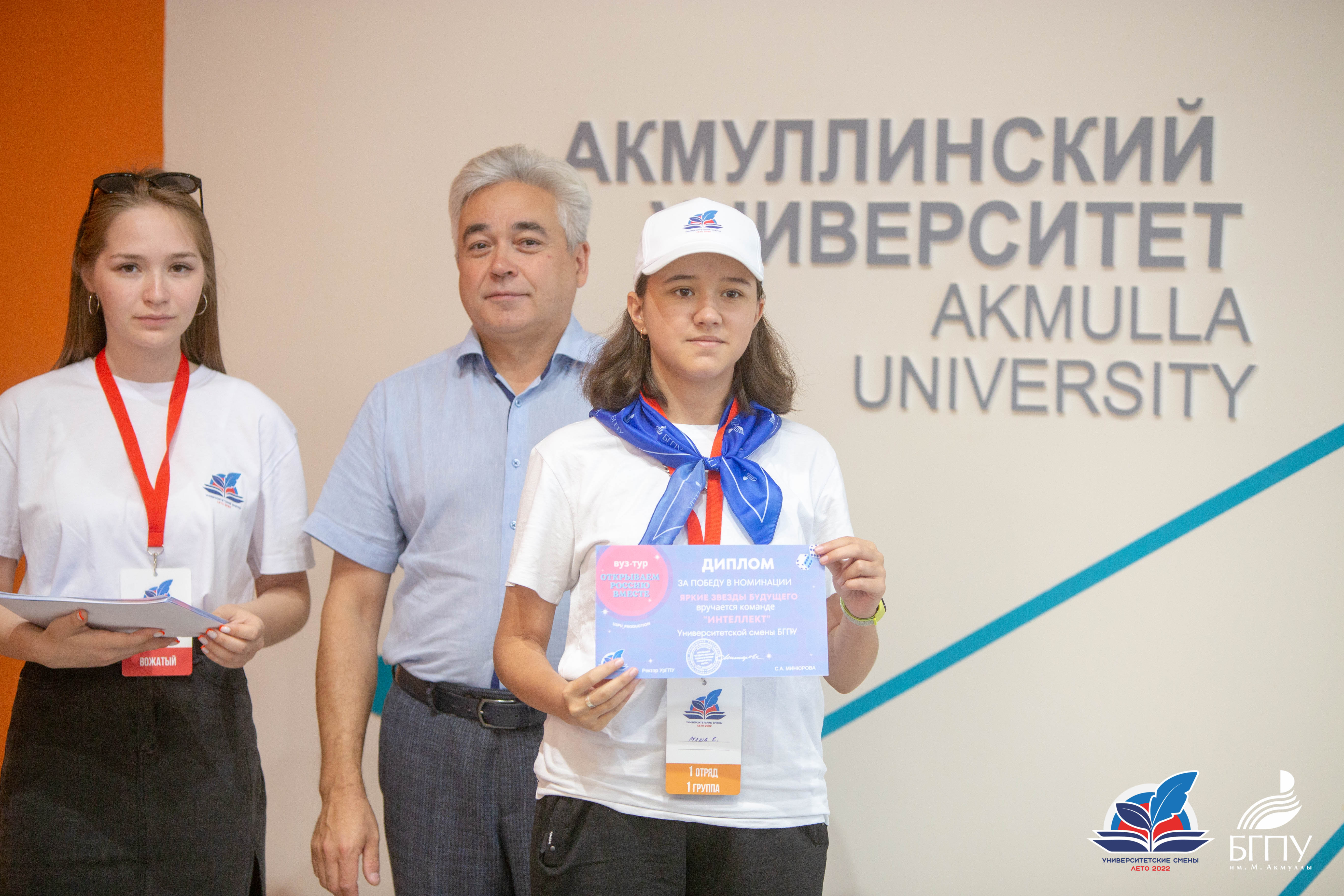 Также в этот день состоялся телемост «Вуз-тур» между педуниверситетами России. Участниками стали четыре вуза, на базе которых реализуется проект Минпросвещения России «Университетские профильные образовательные смены»: Башкирский государственный педагогический университет им. М. Акмуллы, Уральский государственный педагогический университет, Пермский государственный гуманитарно-педагогический университет и Ульяновский государственный педагогический университет имени И.Н. Ульянова. Для детей была организована игра «Открываем Россию вместе», которая включала вопросы из пяти категорий: «Культура», «Достопримечательности», «Традиции», «Музыка» и «Университетские смены». Акмуллинский университет был представлен командой «Интеллект». В результате представители Университетской смены БГПУ им. М. Акмуллы одержали победу в номинации «Яркие звезды будущего».