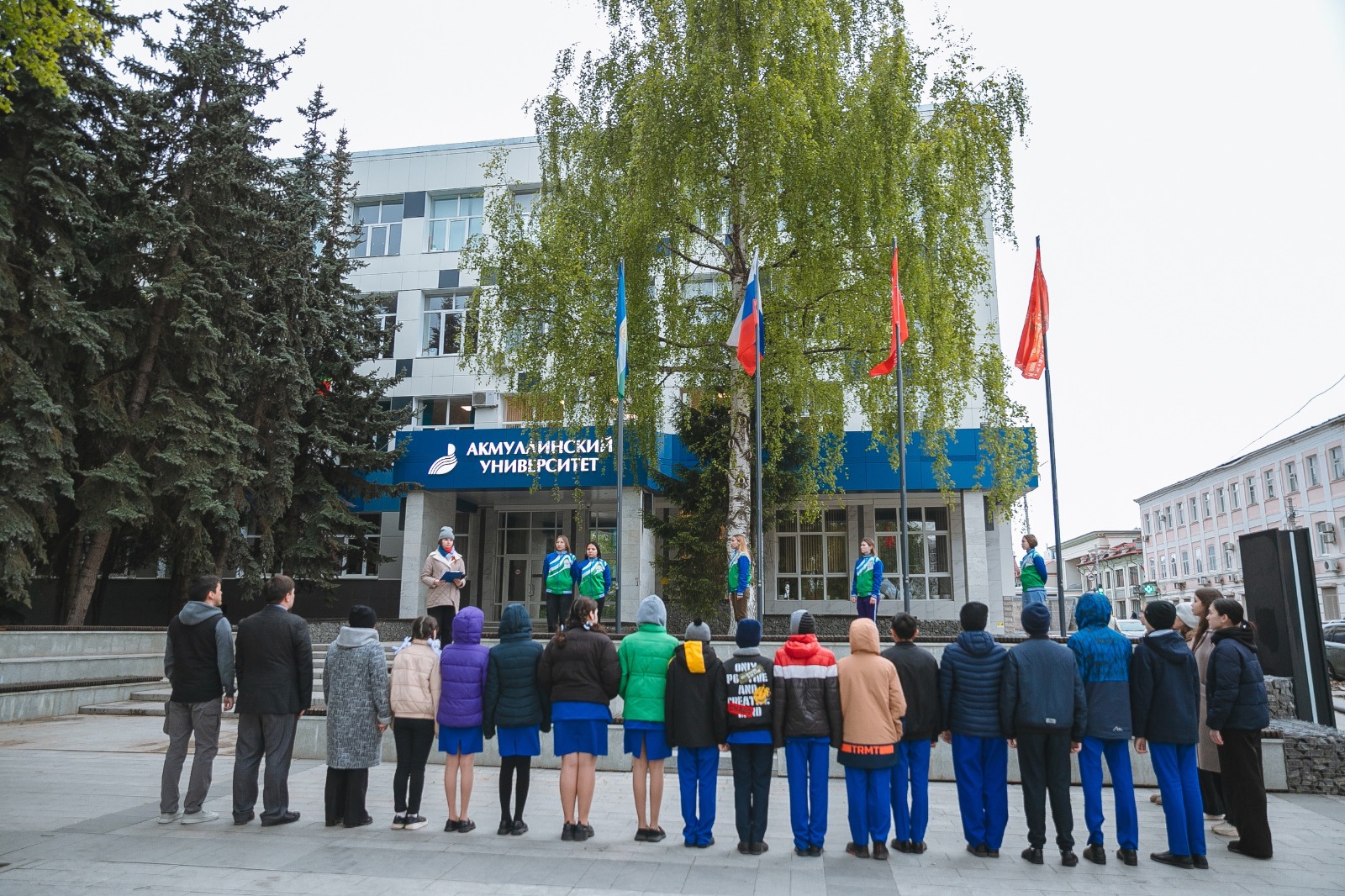 На торжественной церемонии поднятия флагов накануне праздника Великой Победы присутствовали проректор по молодежной политике и международным связям Радик Юлбаев, студенты Акмуллинского университета, обучающиеся 6 класса имени Героя Российской Федерации генерал-майора Минигали Мингазовича Шаймуратова Башкирского лицея № 2 имени Гали Гизетдиновича Ибрагимова.
