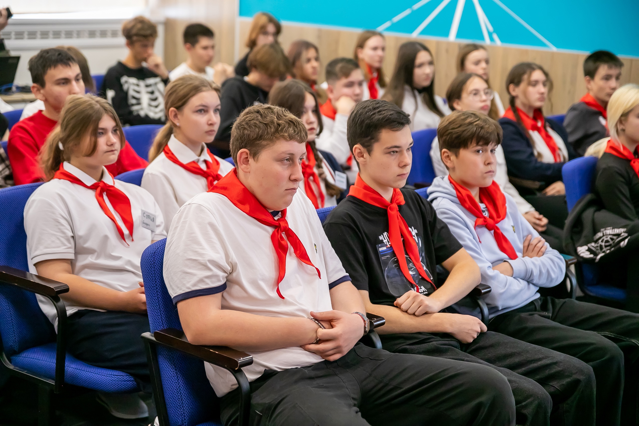 Старший преподаватель кафедры педагогики БГПУ им. М. Акмуллы Алексей Дударенко при участии студентов провел для школьников занятие «Вожатый – профессия птица», которое началось с посвящения в вожатые и повязывания галстуков.