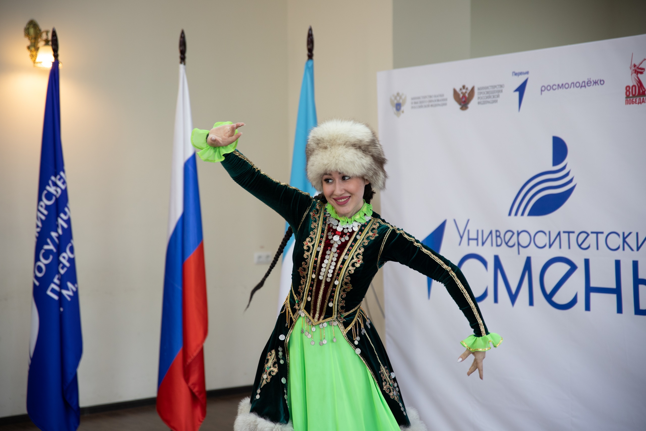 Открытие смены началось с яркого выступления аспирантки Института педагогики Карины Салминой, которая исполнила башкирский народный танец.