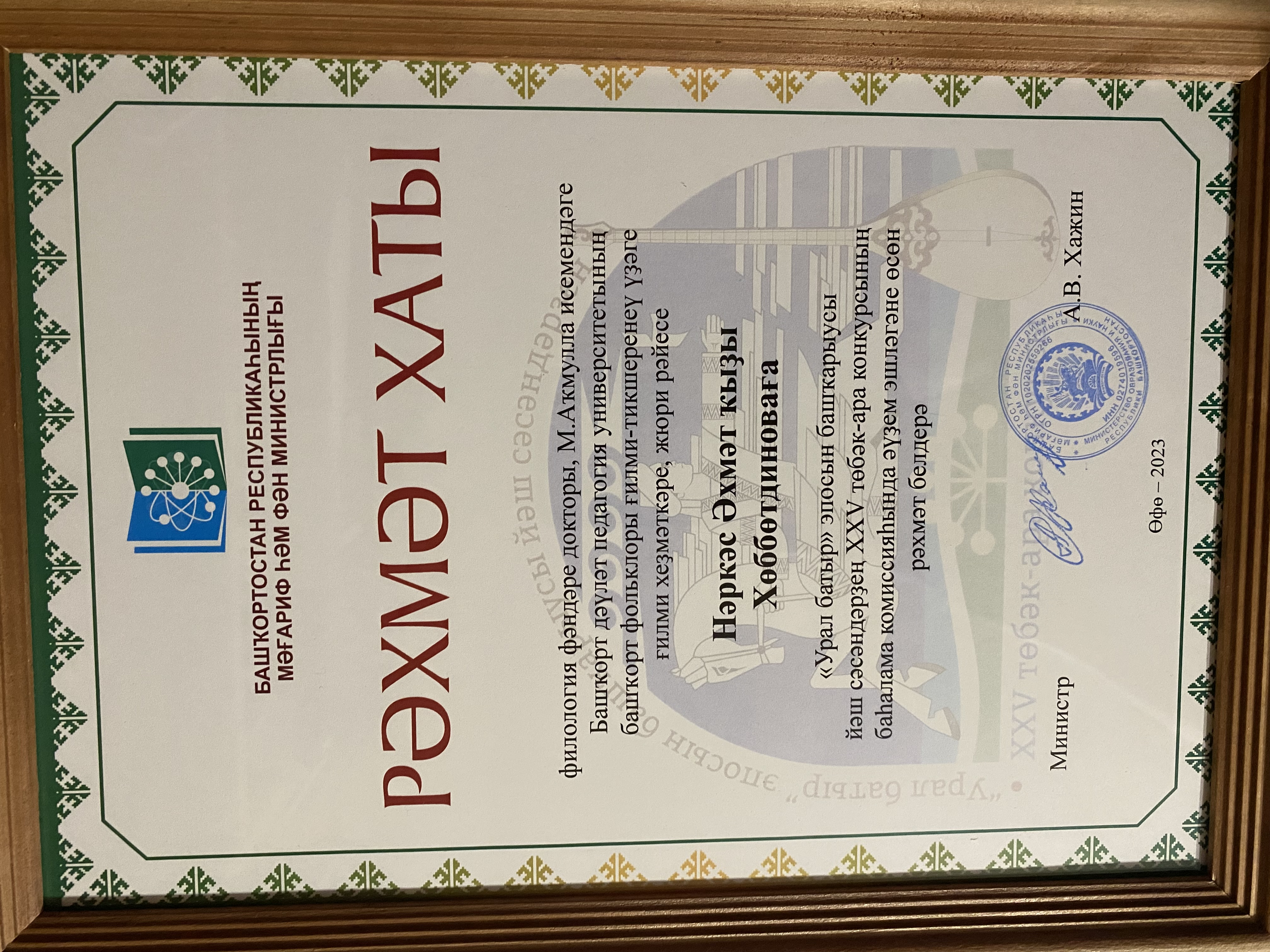 18 августа 2023 г. сотрудники НИ Центра Башкирского фольклора ФГБОУ ВО "БГПУ им. М. Акмуллы" Султангареева Р.А. и Хуббитдинова Н.А. приняли участие на закрытии Межрегионального детского конкурса сказителей эпоса "Урал-батыр" в Бурзянском районе. Хуббитдинова Н.А. - председатель жюри конкурса была награждена медалью "Ал да нур сәс халҡыңа" от Всемирного курултая башкир, также сотрудники Центра были отмечены благодарственными письмами Министерства образования и науки Республики Башкортостан.