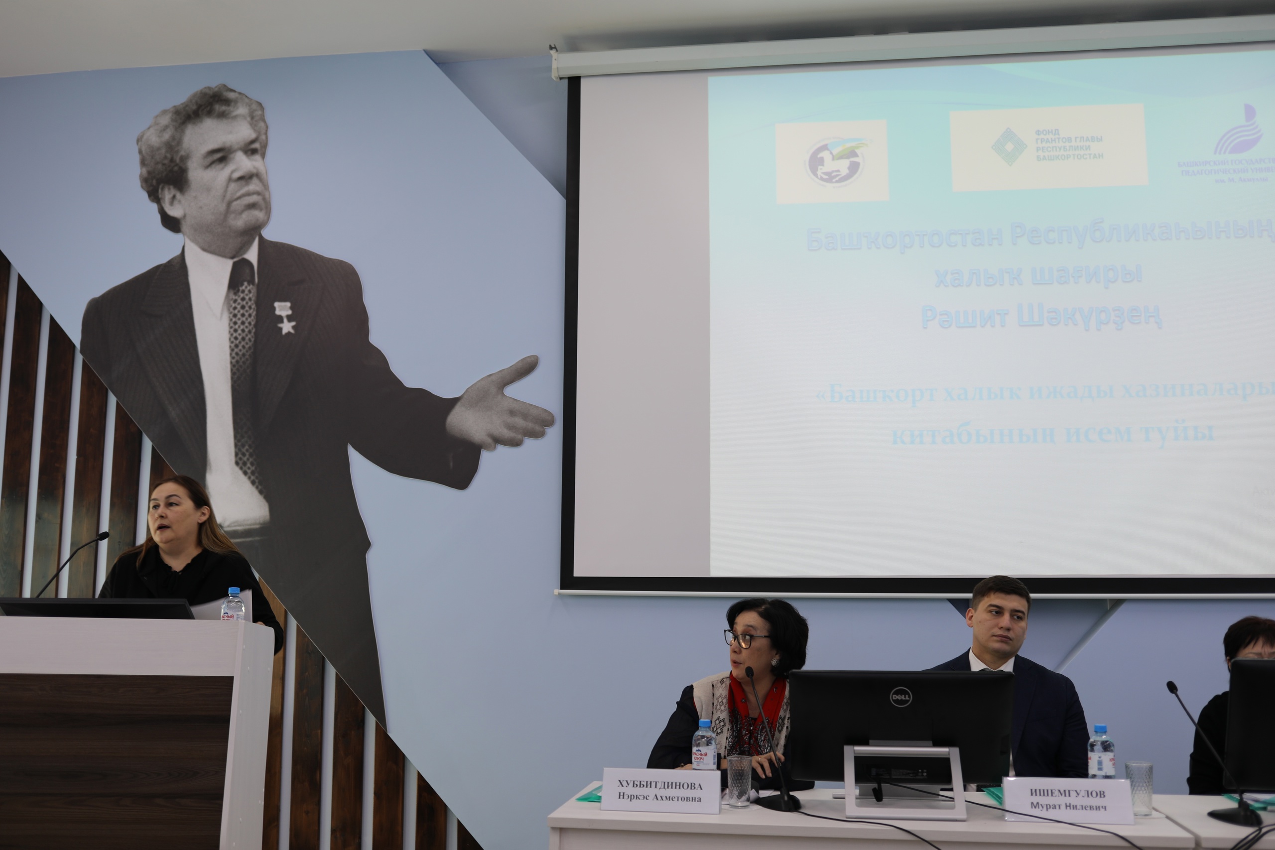 На пленарном заседании старший научный сотрудник НИЦ Башкирского фольклора кандидат филологических наук Шаура Рашитовна Шакурова провела презентацию книги «Башҡорт халыҡ ижады хазиналары» («Сокровища башкирского народного творчества»). Автор и составитель фольклорного сборника – профессор БГПУ им. Акмуллы, известный ученый-энциклопедист, аксакал башкирской литературы, народный поэт Башкортостана, педагог и общественный деятель, почетный гражданин города Уфы Рашит Шакур. Издание книги осуществлено Всемирным курултаем башкир при поддержке фонда грантов Главы РБ. Руководитель проекта – дочь автора книги Шаура Шакурова. Фольклорный сборник является уникальной и востребованной, содержит в себе кропотливо и бережно собранный материал башкирского народного творчества. В книгу вошли образцы различных жанров, собранных ученым с 1960-х годов в ходе его многочисленных экспедиций по Республике Башкортостан, в Свердловской, Челябинской, Курганской, Оренбургской областях РФ. Для БГПУ им. Акмуллы особенно ценно то, что Рашит Закирович включал в свои фольклорные коллекции лучшие работы своих студентов, таким образом, приобщал их к исследовательской работе, прививал интерес к родной культуре. В новой книге Рашита Шакурова так же есть и материал, собранный нашими студентами БГПУ им.Акмуллы.