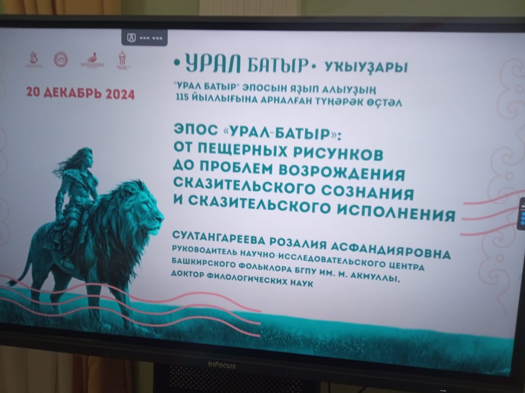 В рамках круглого стола с докладом на тему «Эпос «Урал-батыр»: от пещерного рисунка до сказительских традиций и искусства XXI века» выступила руководитель Научно-исследовательского центра Башкирского фольклора Султангареева Р.А. Её выступление было посвящено истории возникновения и развития эпоса, начиная с древнейших времен и заканчивая современными интерпретациями в искусстве.