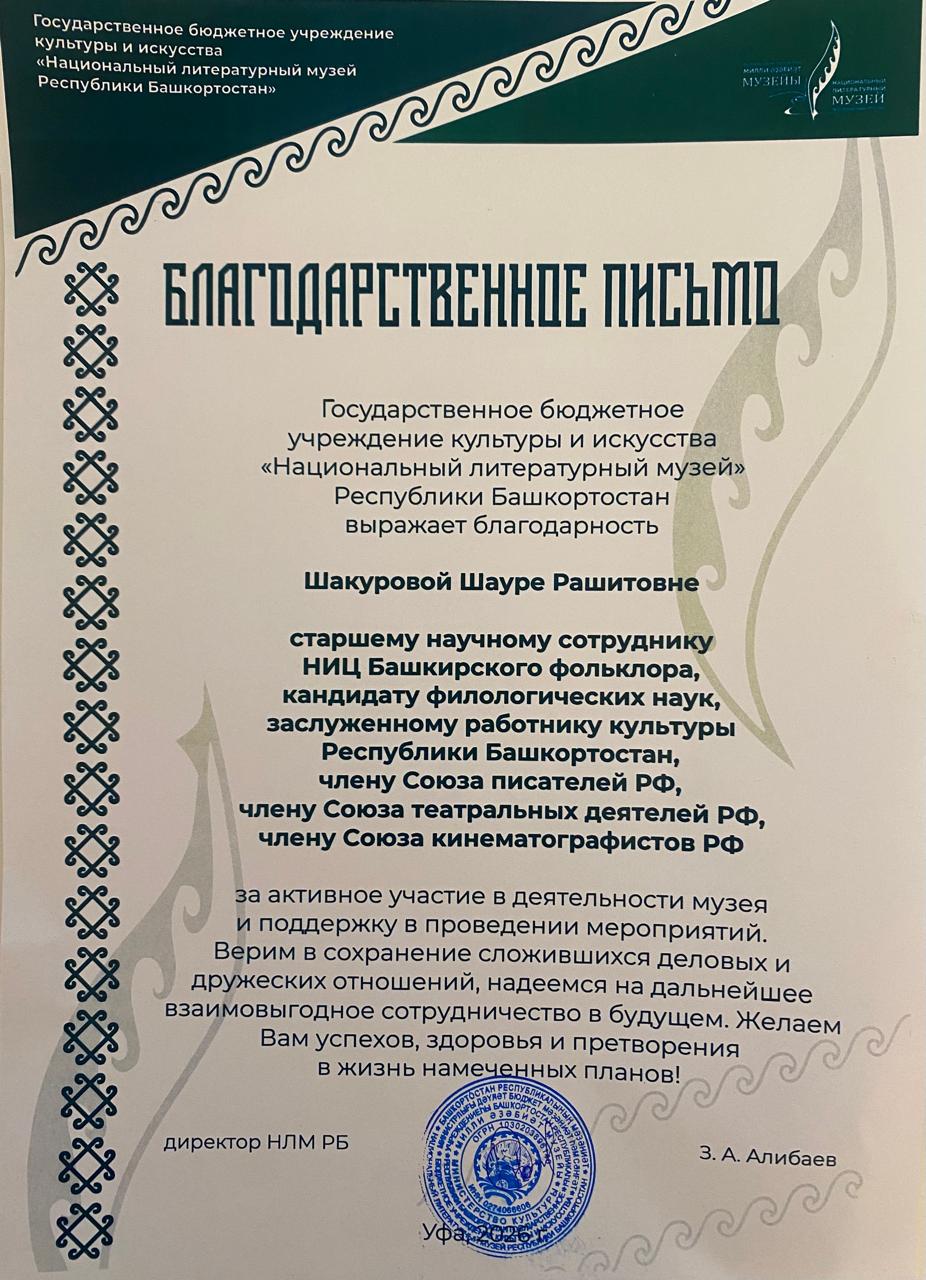 Национальный литературный музей РБ наградил Шауру Шакурову Благодарственным письмом за активное участие в мероприятиях музея.