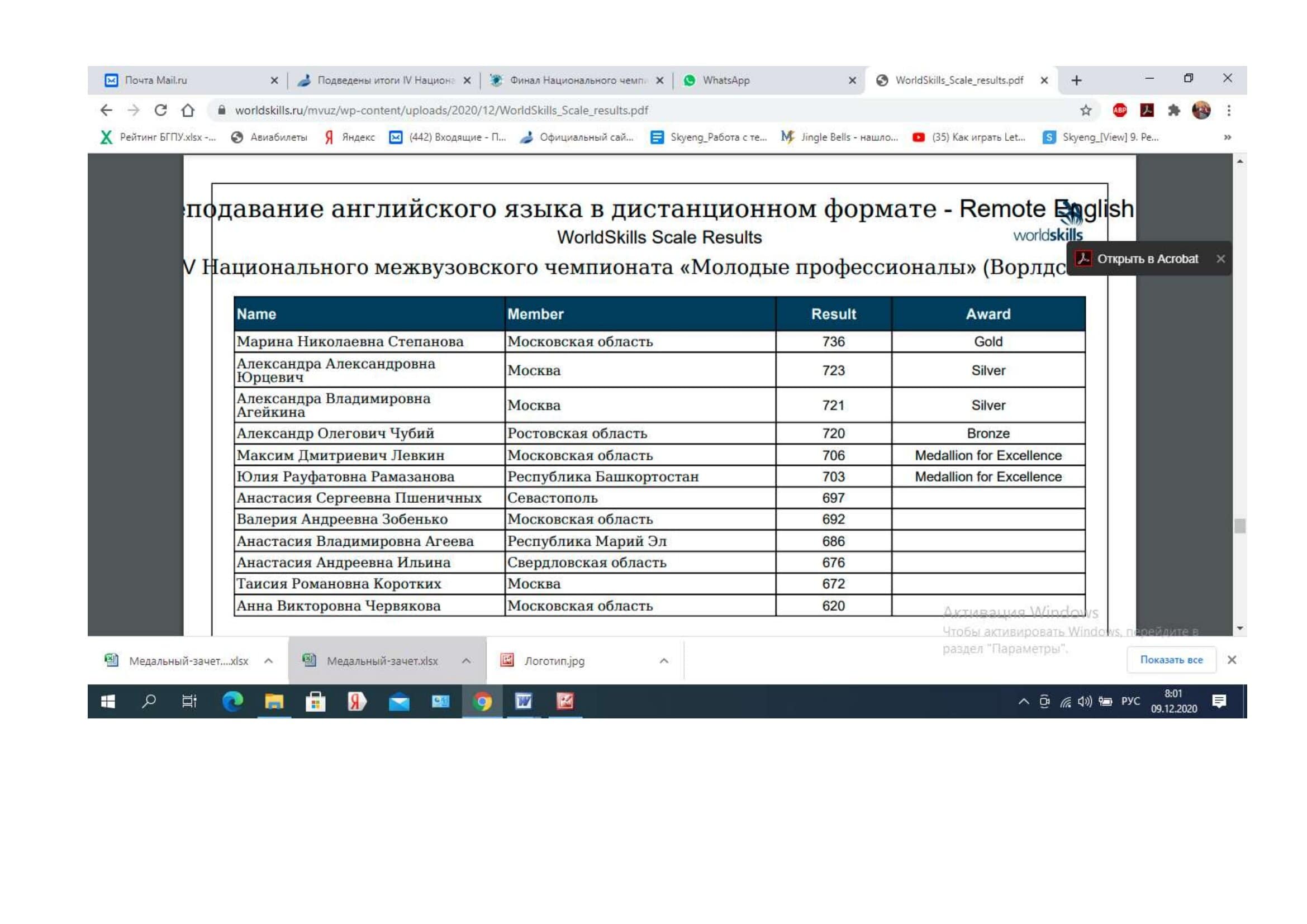 Медальон за профессионализм получила студентка 5 курса Института филологического образования и межкультурных коммуникаций (ПОИЯ) Юия Рамазанова, выступившая в компетенции Преподавание английского языка в дистанционном формате, которая набрала за выполнение основных заданий более 700 баллов и заслужила право на награду. В качестве компатриота выступила Ксения Сергеевна Марфина, преподаватель кафедры межкультурной коммуникации и перевода.