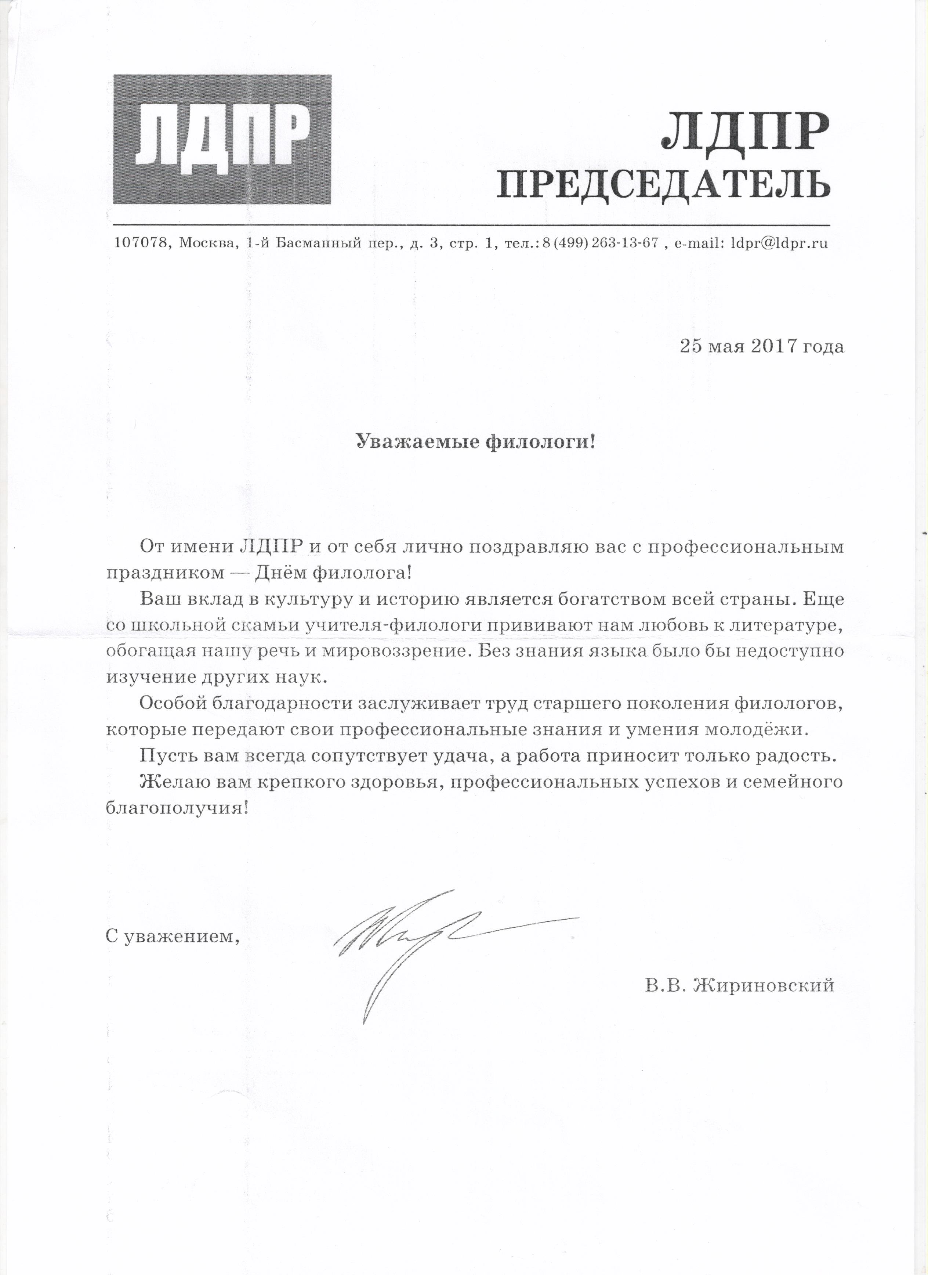 Депутат Государственной Думы В.В. Жириновский поздравил филологов БГПУ с профессиональным праздником