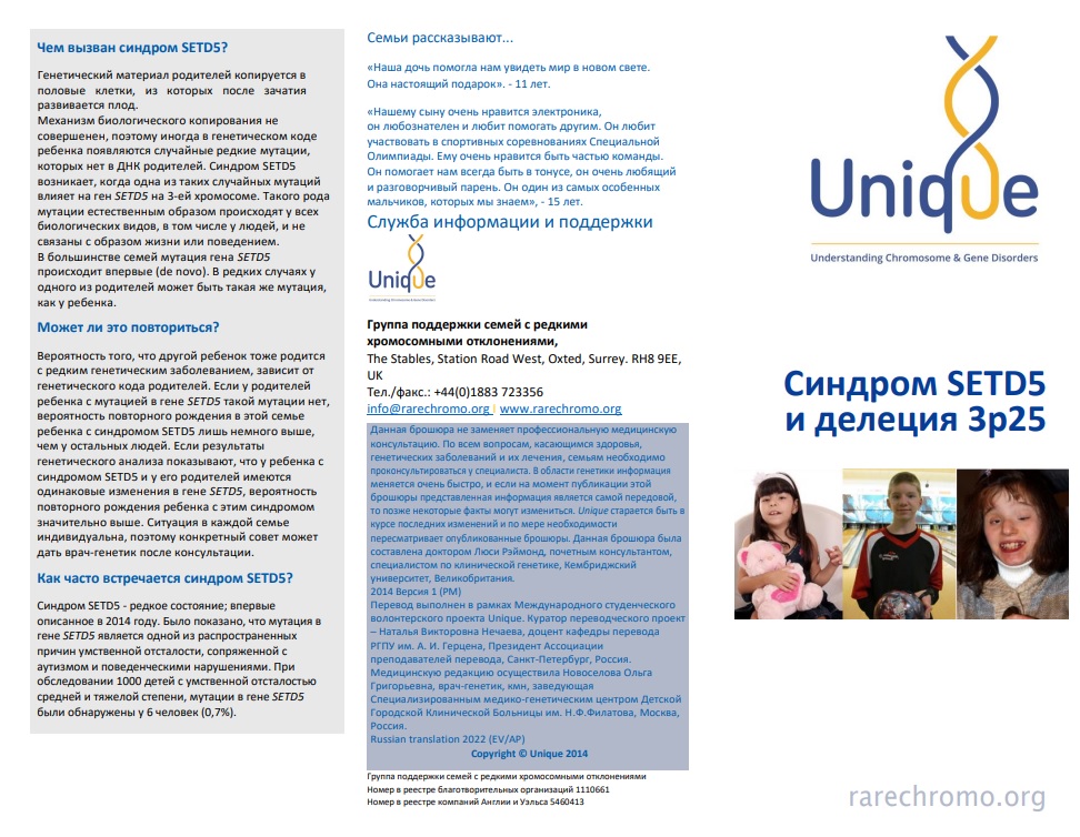 На сайте проекта опубликованы первые переводы 2022 года. Выпускница БГПУ им. М. Акмуллы Альфия Гатина перевела брошюру «Синдром SETD5 и делеция 3p25». Ее работа была опубликована, со статьей на русском языке можно ознакомиться по ссылке https://rarechromo.org/media/t...