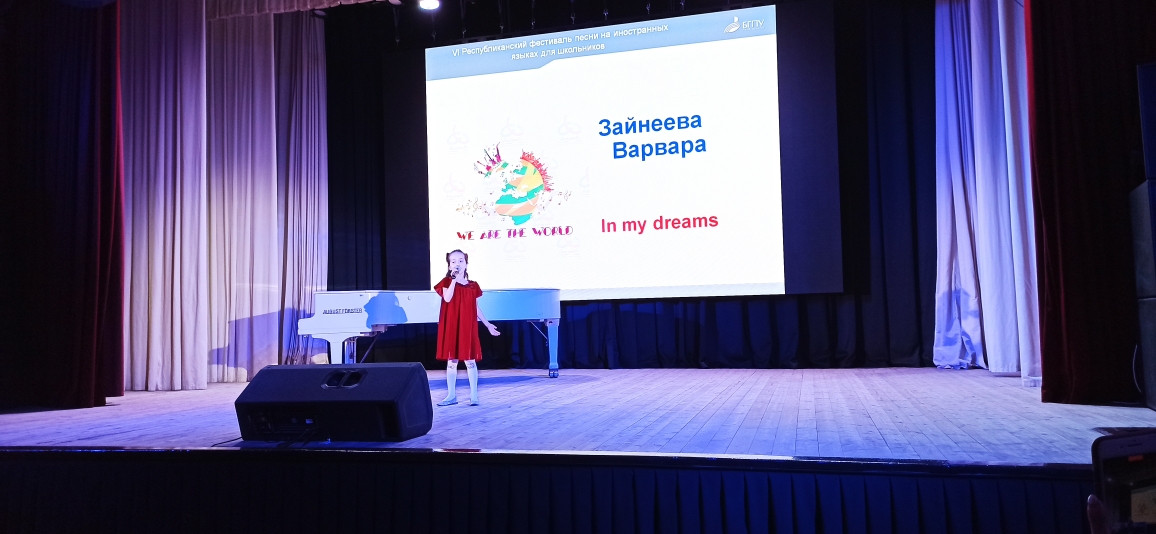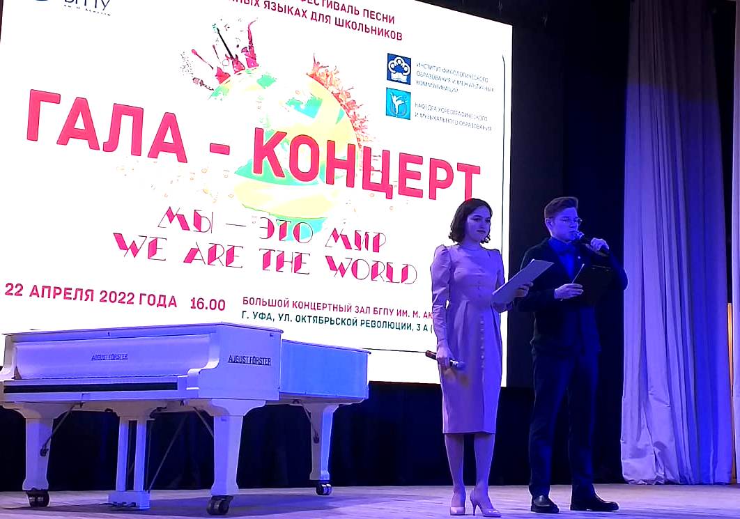 22 апреля 2022г. в концертном зале БГПУ им. М Акмуллы прошел гала-концерт IV Республиканского фестиваля песни на иностранных языках для школьников. Организаторами конкурса и Гала –концерта «Мы – это мир» (We are the World) выступила кафедра методики преподавания иностранных языков и второго иностранного языка (заведующий кафедрой В.Ф. Аитов) с непосредственным участием кафедры музыкального и хореографического образования (заведующий кафедрой Т.И. Политаева).