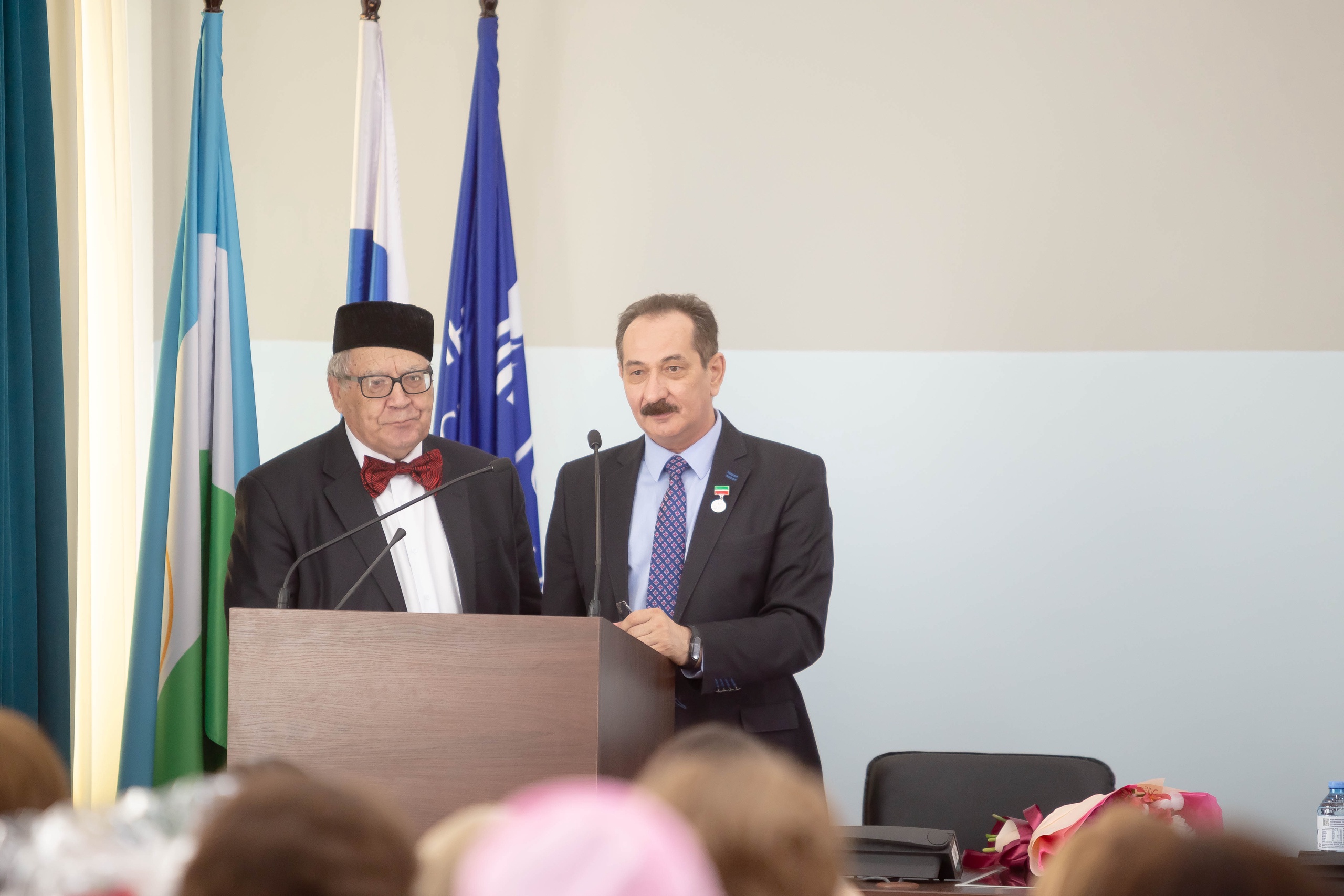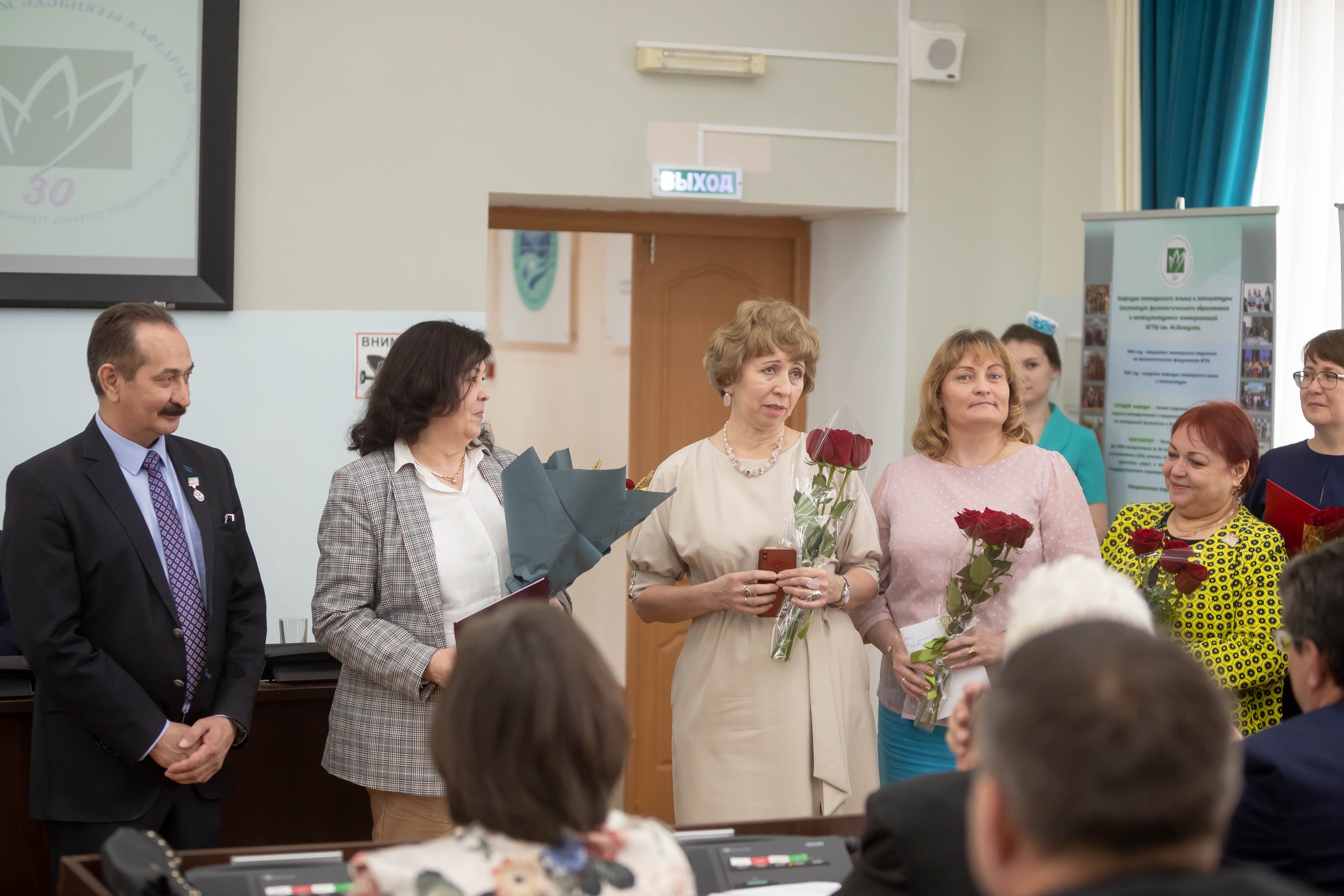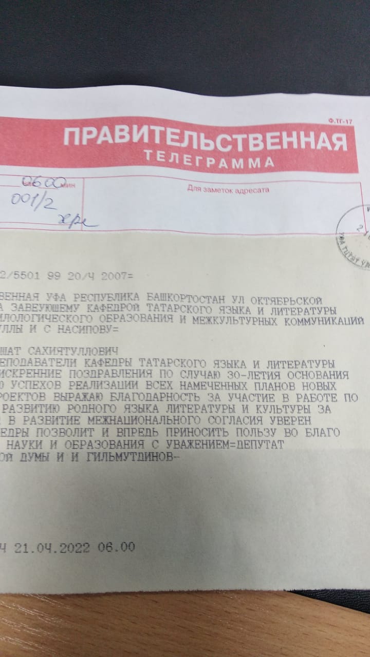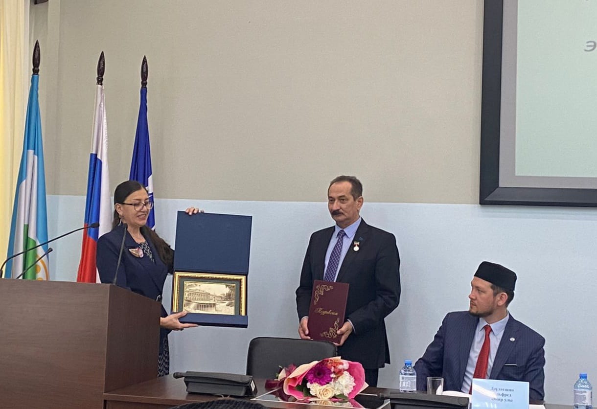 Заместитель постоянного представителя Республики Татарстан в Республике Башкортостан М.З. Валиев и представитель Всемирного конгресса татар в Республике Башкортостан А.А. Давлетшин также поздравили собравшихся с 30-летним юбилеем кафедры. После они вручили ведомственные награды Министерства образования и науки Татарстана и Всемирного конгресса татар сотрудникам кафедры татарского языка ИФОМК И.С. Насипову, А.Г. Халиуллиной, Н.У. Халиуллиной, Ф.Ф. Фатхтдинову, А.А. Нугумановой.