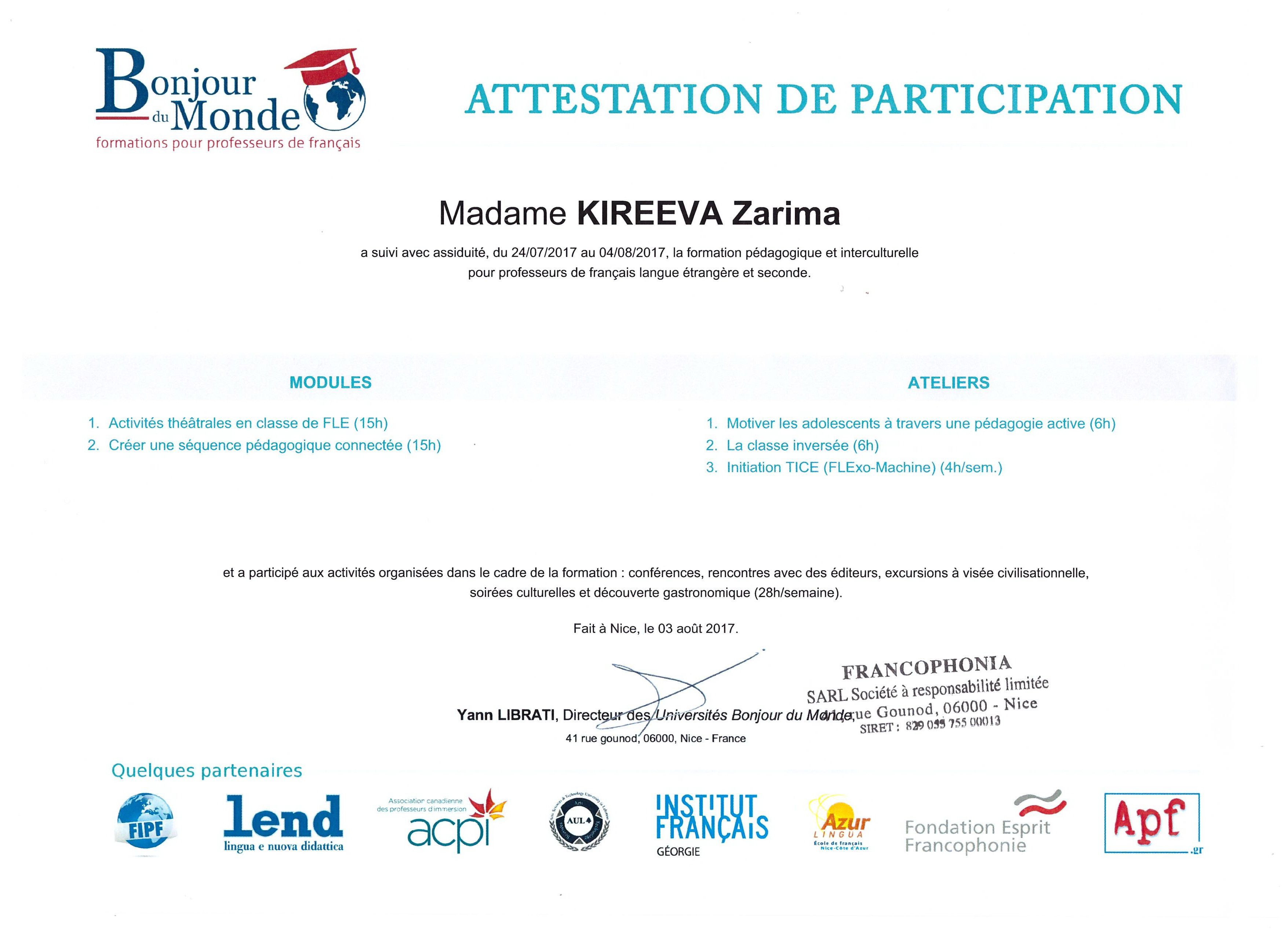 С 24 июля по 4 августа 2017 года доцент кафедры методики преподавания  иностранных языков и второго иностранного языка З. Р. Киреева прошла двухнедельное обучение в г. Ницца по программе «Университеты мира».
