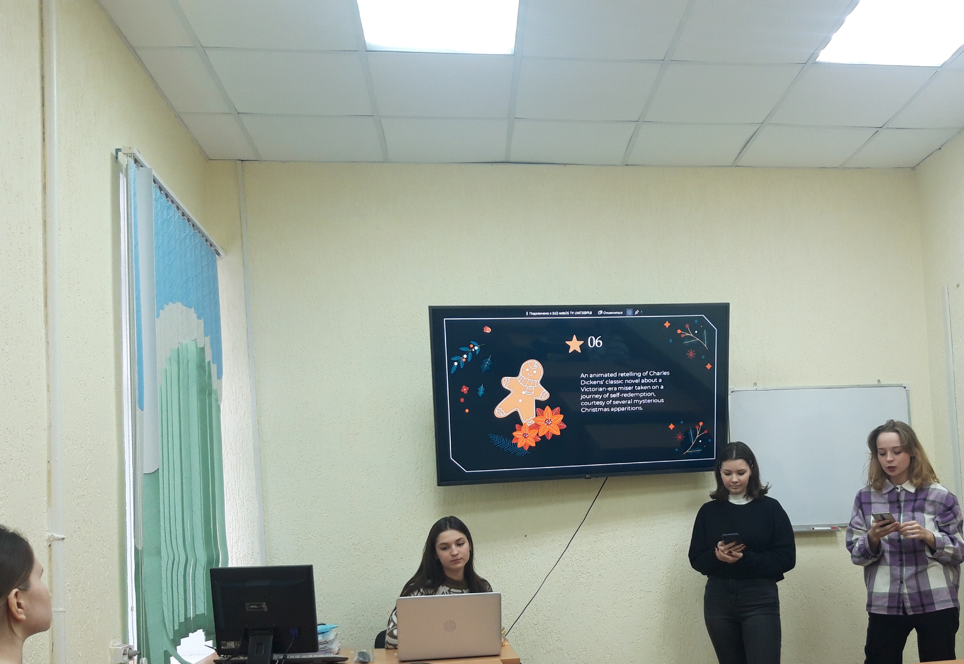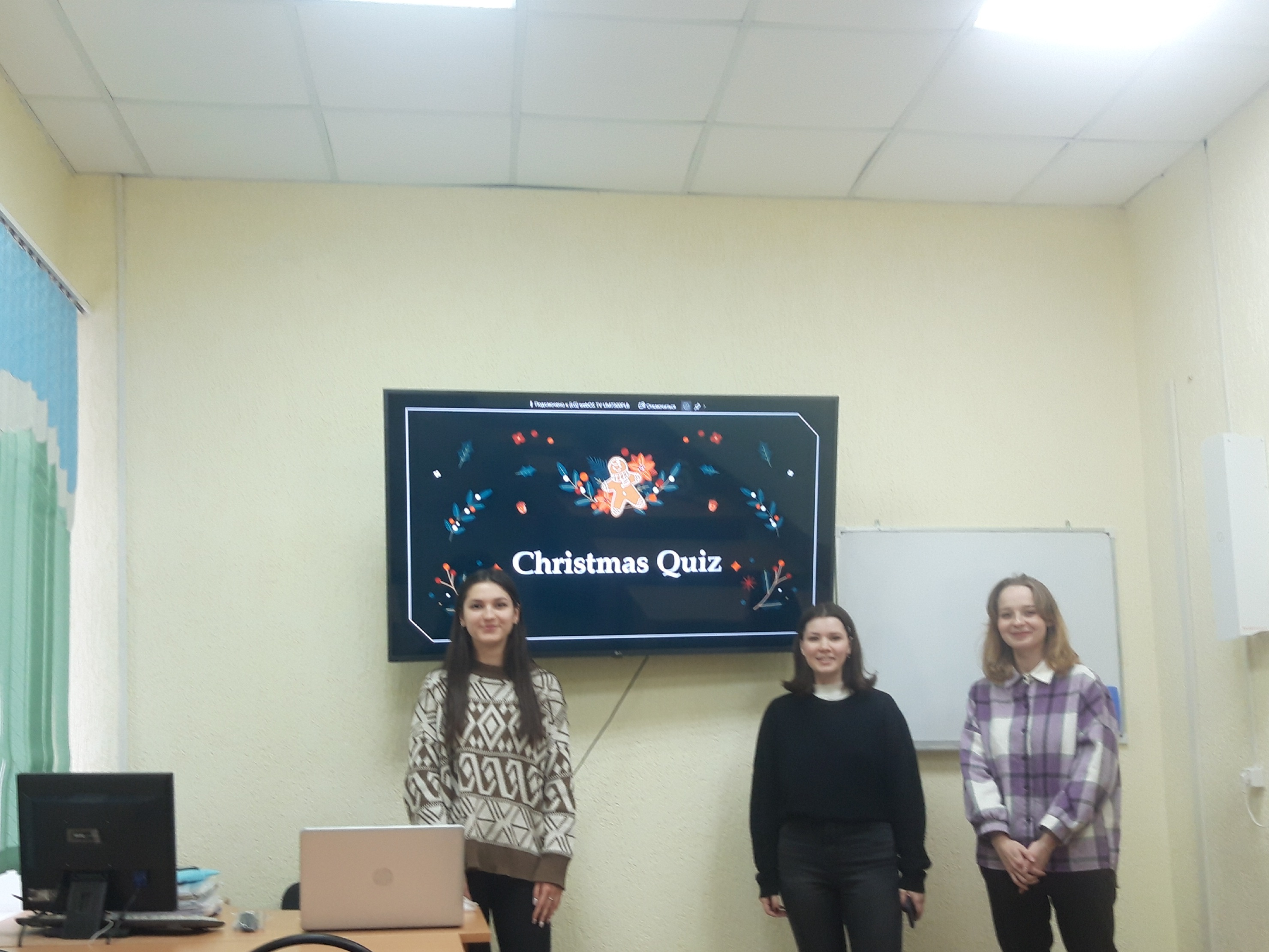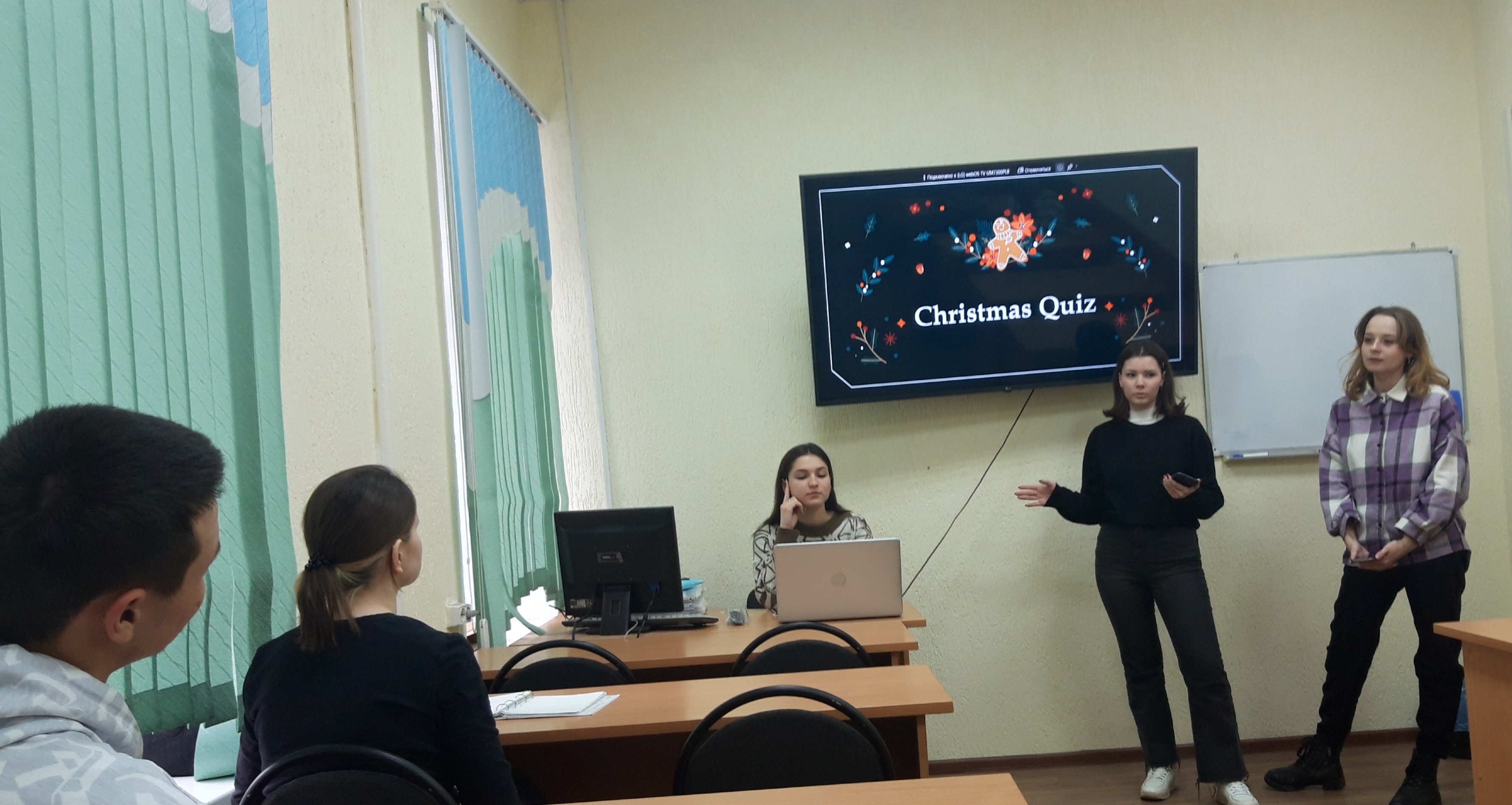 Далее студенты Софья Петрова, Сабина Габитова и Софья Смаровоз организовали и провели рождественскую викторину на английском языке, где необходимо было вспомнить названия новогодних и рождественских фильмов.