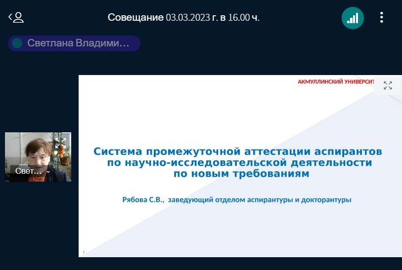 03 марта состоялось совещание по вопросу организации научно-методических семинаров по аттестации аспирантов во втором семестре 2022-2023 уч. года. В 2022 году было утверждено новое положение о научно-методическом семинаре как форме аттестации аспирантов, отметила заведующий отделом аспирантуры БГПУ им. М. Акмуллы Светлана Рябова и предложила апробировать новую систему промежуточной аттестации аспирантов, включающую вариативность представления результатов работы аспирантов (выступление по теоретическим или практическим результатам исследования, представление научной публикации, обоснование темы и структуры исследования).