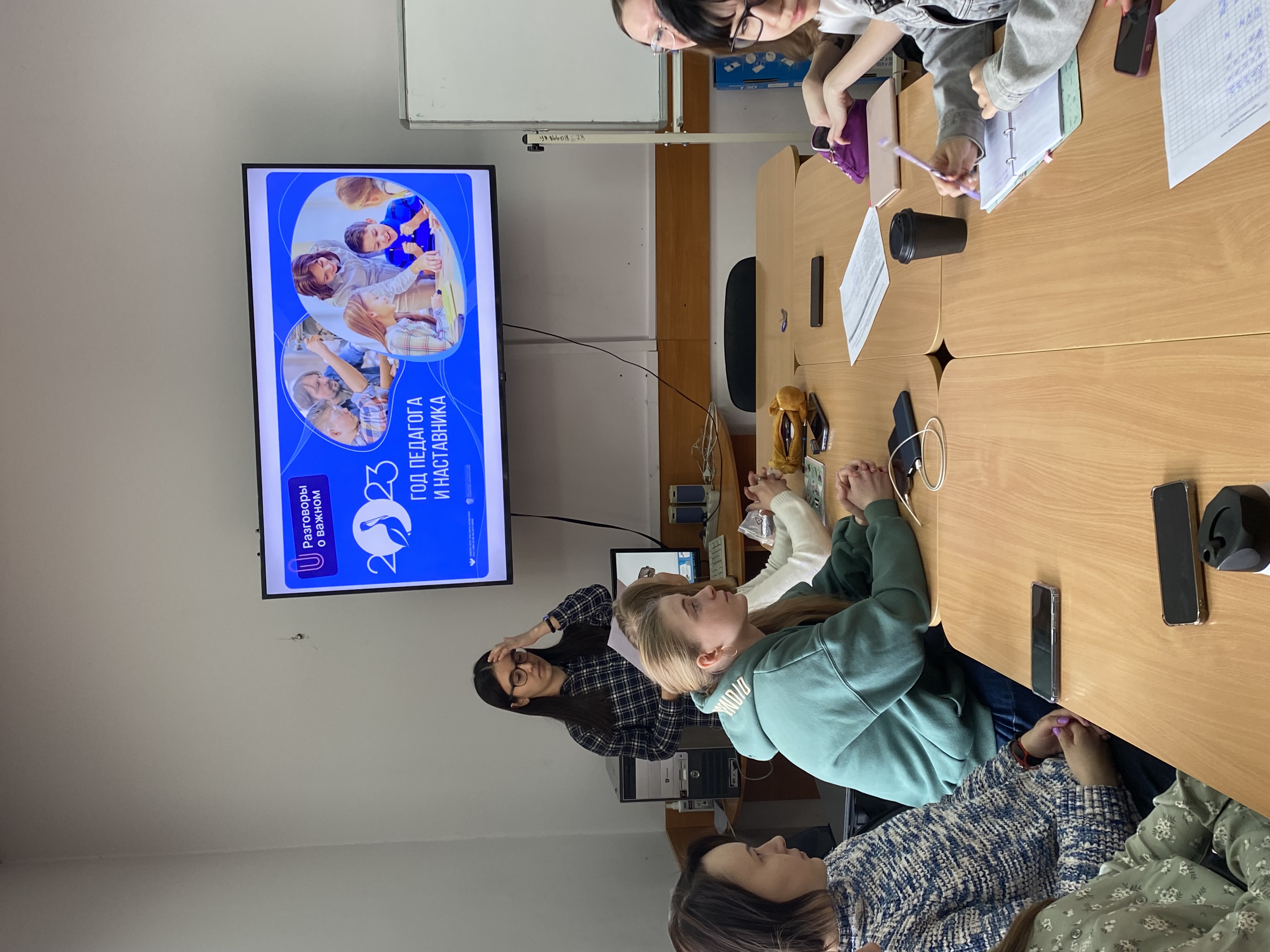 6 марта 2023 года на 3 курсе направления подготовки «Педагогическое образование», профиль «Иностранный (английский) и немецкий язык» в рамках проекта «Разговоры о важном» прошел кураторский час на тему «Год педагога и наставника». Цель занятия: формирование представления у обучающихся о значимой роли педагога в становлении личности каждого человека; формирование у обучающихся чувства благодарности и уважения к родителям, педагогам, наставникам; понимания, что служение Отечеству проявляется, в числе прочего, и в форме наставничества; представления о качествах, которые необходимы тому, кого можно назвать наставником. Докладчиком выступила Абнасырова Алсу. На занятии будущие педагоги просмотрели несколько видеороликов и ответили на «несколько почему»: Почему педагогу недостаточно знать только свой предмет? Почему важно, чтобы педагог был и немного психологом, актером, исследователем, экспериментатором? Почему работа педагога не заканчивается после звонка с последнего урока? Дискуссия состоялась при ответе на вопрос: Быть педагогом – это профессия или призвание?